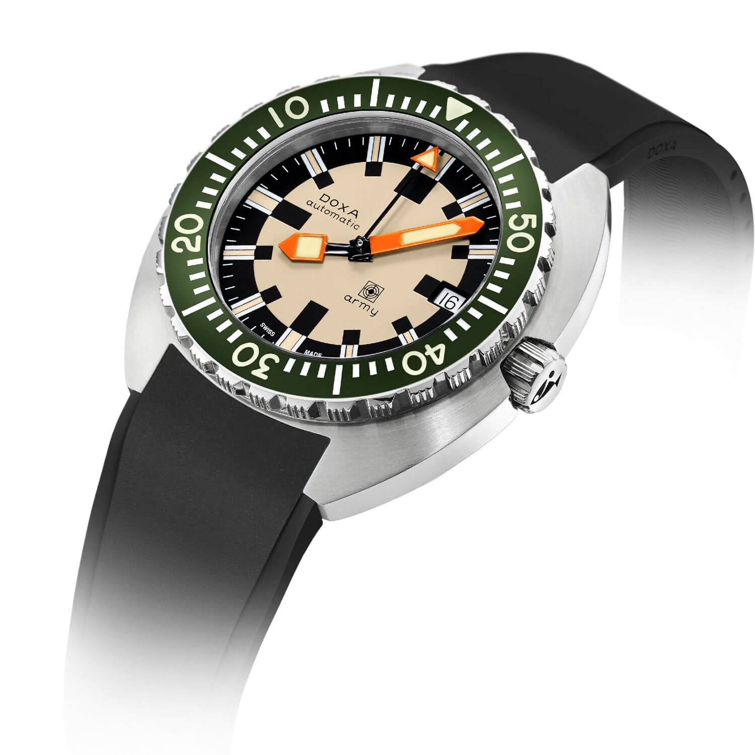 Tarcza w kolorze piaskowego beżu z czarnym pierścieniem wewnętrznym i kontrastującymi indeksami przypomina o wojskowym rodowodzie tego modelu – czytelność i funkcjonalność są tu priorytetem. Grube, pomarańczowe wskazówki pokryte masą Super-LumiNova® gwarantują błyskawiczny odczyt nawet w całkowitej ciemności, a datownik na godzinie trzeciej dodaje praktycznego charakteru bez naruszania równowagi projektu. Wewnątrz koperty pracuje automatyczny mechanizm SW200-1 Swiss Made — precyzyjny, niezawodny i gotowy do działania tak długo, jak długo porusza się jego właściciel. Werk posiada rezerwę chodu do 41 godzin. Zegarek automatyczny Doxa Army 785.10.031G.20 na pasku gumowym to nie gadżet retro – to reedycja nurkowego narzędzia z charakterem, zaprojektowana z myślą o tych, którzy wymagają od zegarka znacznie więcej niż tylko punktualności.