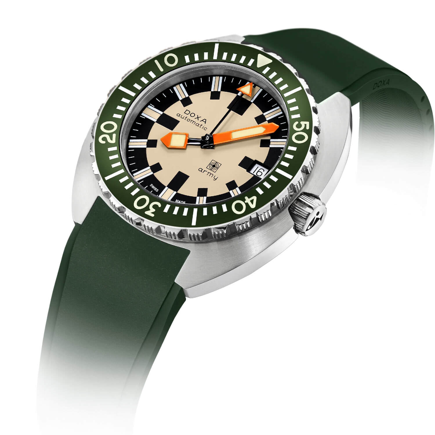 Tarcza w kolorze piaskowego beżu z czarnym pierścieniem wewnętrznym i kontrastującymi indeksami przypomina o wojskowym rodowodzie tego modelu – czytelność i funkcjonalność są tu priorytetem. Grube, pomarańczowe wskazówki pokryte masą Super-LumiNova® gwarantują błyskawiczny odczyt nawet w całkowitej ciemności, a datownik na godzinie trzeciej dodaje praktycznego charakteru bez naruszania równowagi projektu. Wewnątrz koperty pracuje automatyczny mechanizm SW200-1 Swiss Made — precyzyjny, niezawodny i gotowy do działania tak długo, jak długo porusza się jego właściciel. Werk posiada rezerwę chodu do 41 godzin. Zegarek automatyczny Doxa Army 785.10.031G.26 na pasku gumowym to nie gadżet retro – to reedycja nurkowego narzędzia z charakterem, zaprojektowana z myślą o tych, którzy wymagają od zegarka znacznie więcej niż tylko punktualności.