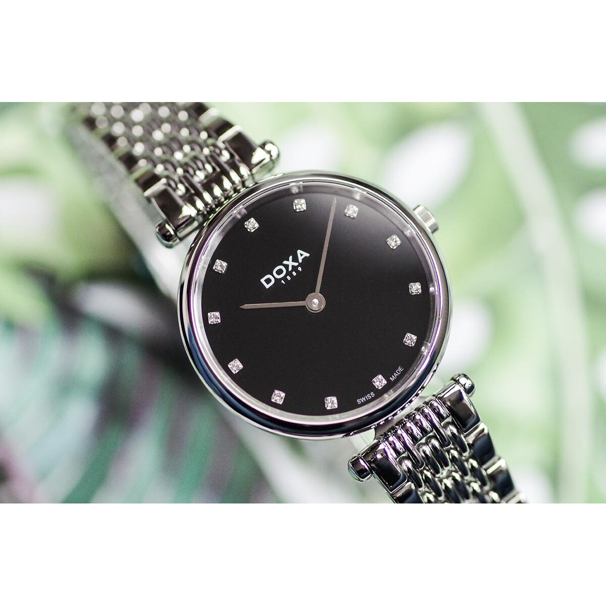 DOXA D-LUX 111.15.108.10 jak sama nazwa wskazuje to zegarek luksusowy przeznaczony dla pań. Elegancka, cienka koperta o średnicy 24 mm wykonana z polerowanej stali szlachetnej tak samo jak przyjemna i lekka bransoletka. Wyjmowane ogniwa pozwalają na dopasowanie do każdego damskiego nadgarstka. Zapięcie motylkowe otwierane za pomocą przycisków jest bezpieczne i przyjemne w użytkowaniu. Piękną, klasyczną tarczę w kolorze czarnym ozdobioną błyszczącymi kryształkami chroni odporne na zarysowania szkło szafirowe. Doxa D-Lux to modny dodatek nie tylko do eleganckiej kreacji, ale i na co dzień, ponadczasowy wzór i wykonanie na wysokim poziomie.
