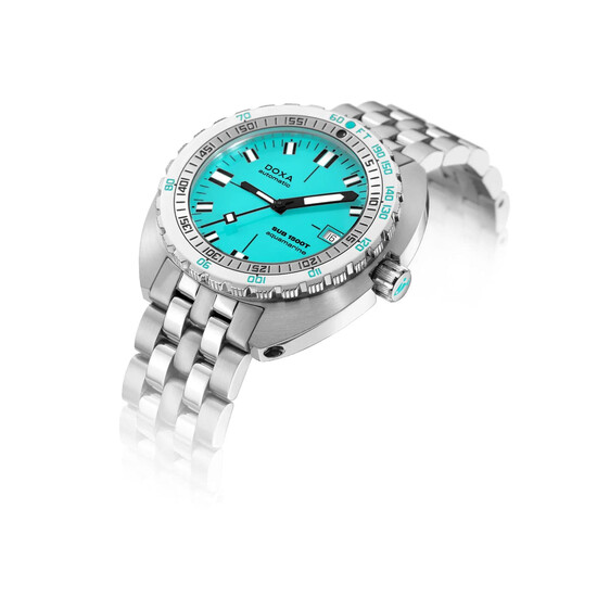 Nowy zegarek nurkowy Doxa SUB 1500T Aquamarine jest wyposażony w 45-milimetrową, wytrzymałą kopertę ze zintegrowanym zaworem uwalniania helu — tym samym, co jego legendarny poprzednik. Co więcej, posiada on opracowaną dla serii SUB w 1964 roku, opatentowaną ramkę z podwójnym oznaczeniem czasu nurkowania (minuty) i głębokości (w stopach). Wszystko po to, aby obliczyć bezpieczne wynurzenie bez przystanków dekompresyjnych.