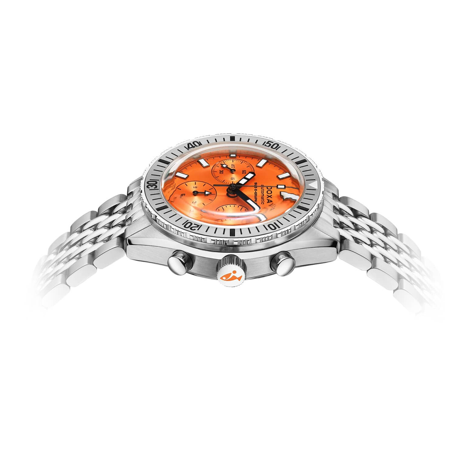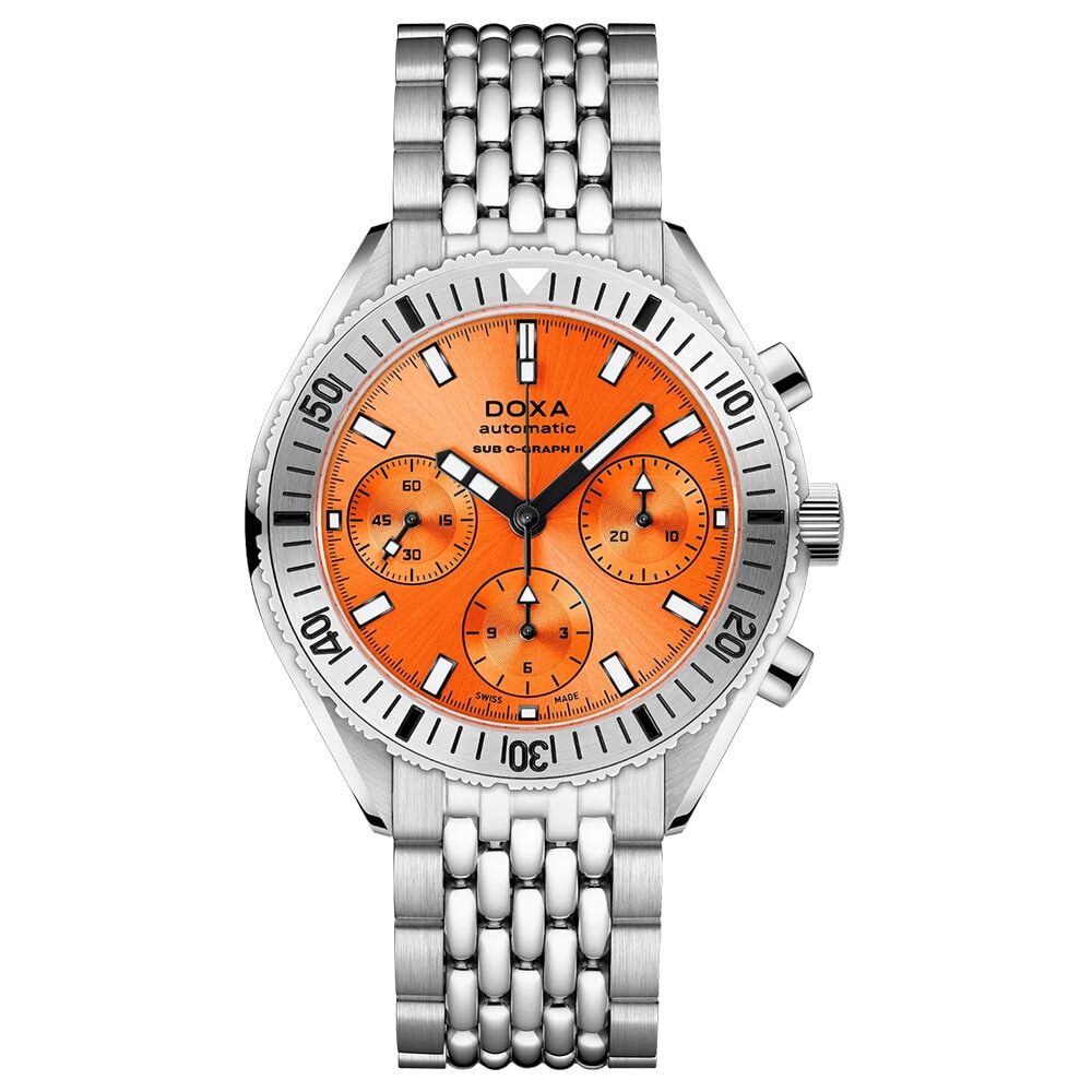 Nurkowy zegarek męski wodoszczelny do 200 metrów Doxa SUB 200 C-Graph II. Napędzany przez wysoce precyzyjny, szwajcarski mechanizm z automatycznym naciągiem i komplikacją chronografu (28 800 vph, 4,0 Hz, 27 klejnotów, 56 godzin rezerwy mocy). Umieszczony w pomniejszonej, bardziej współczesnej — w stosunku do poprzednika — kopercie o średnicy 42 mm i grubości 15,85 mm. Zarówno etui, jak i kultowa bransoleta „koraliki ryżu” wykonana jest z antyalergicznej i odpornej stali szlachetnej 316L. Powyższy wariant Doxa SUB 200 C-Graph II Professional 797.10.351.10 wyróżnia pomarańczowy kolor tarczy oraz stalowy bezel obracający się w jedną stronę.