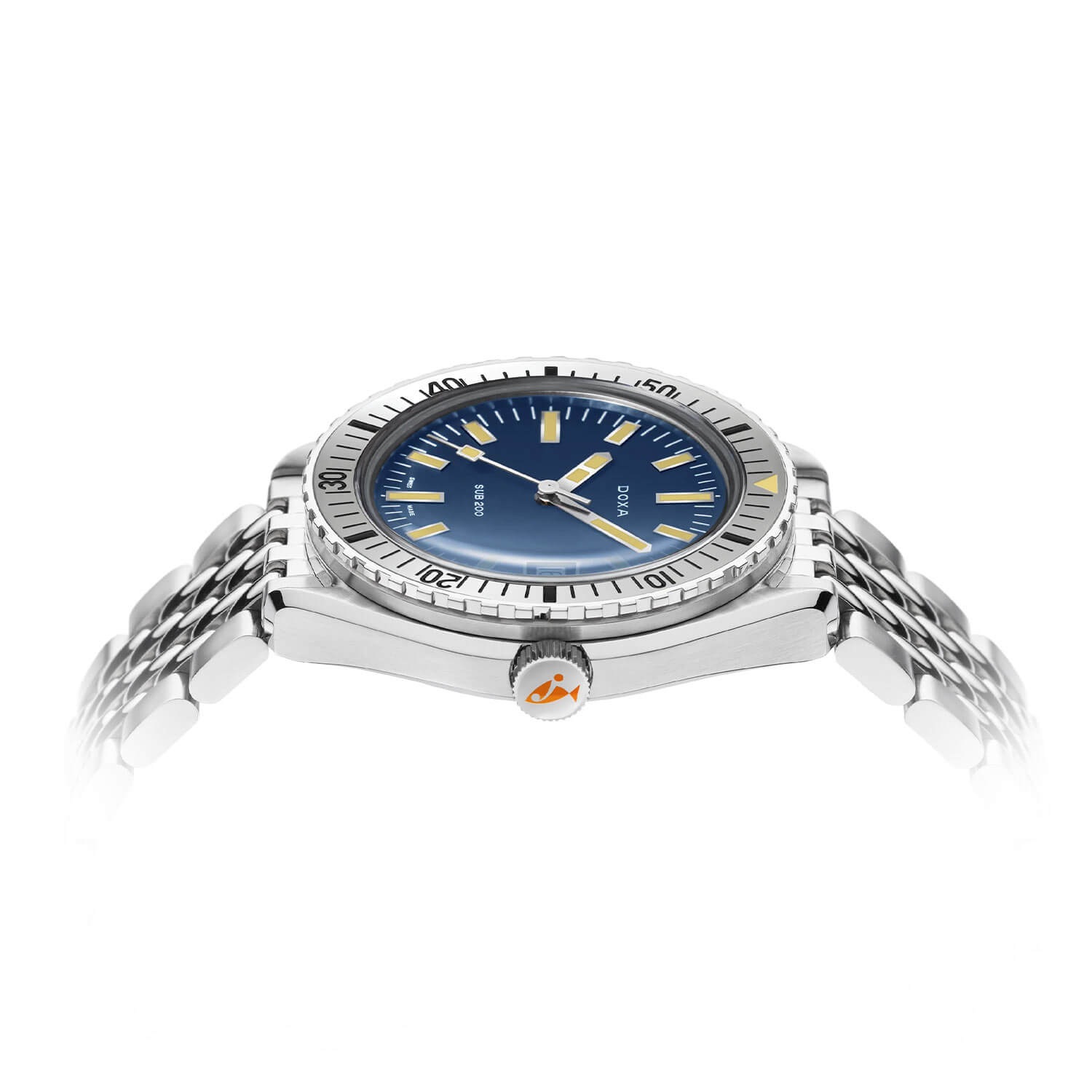 Pod szafirowym szkłem znajduje się niebieska tarcza – odcień, który pozwoli błyskawicznie odczytać aktualny czas. Jej barwa zapewnia maksymalny kontrast i widoczność pod wodą, a indeksy oraz wskazówki pokryte masą Super-LumiNova® pozostają czytelne nawet w ciemności. Na godzinie trzeciej umieszczono datownik w ramce, który nie zakłóca harmonii projektu. Zegarek nurkowy Doxa SUB Automatic 7961020110 na bransolecie to nie jest czasomierz do witryny – to rasowy diver gotowy do działania.