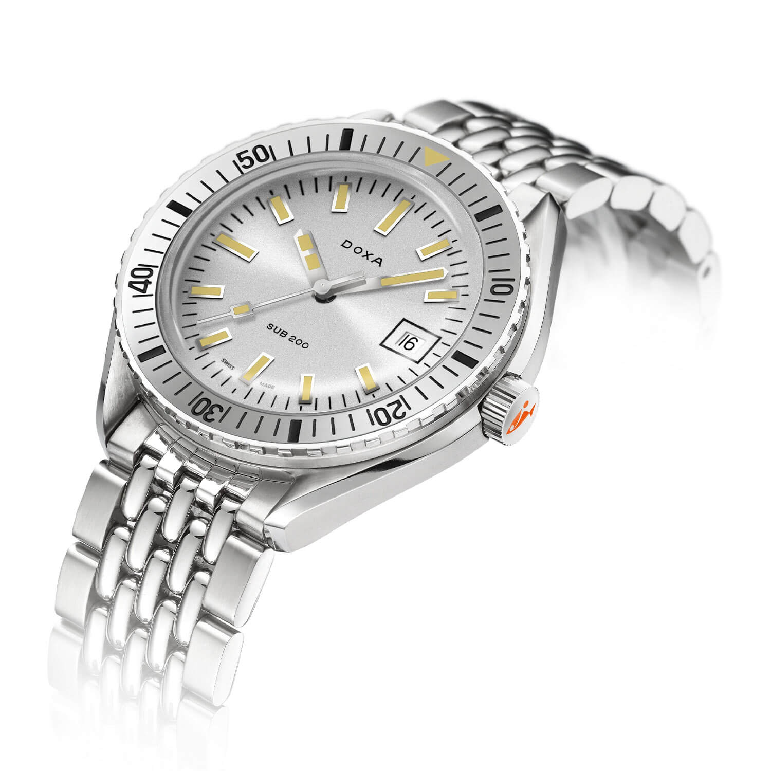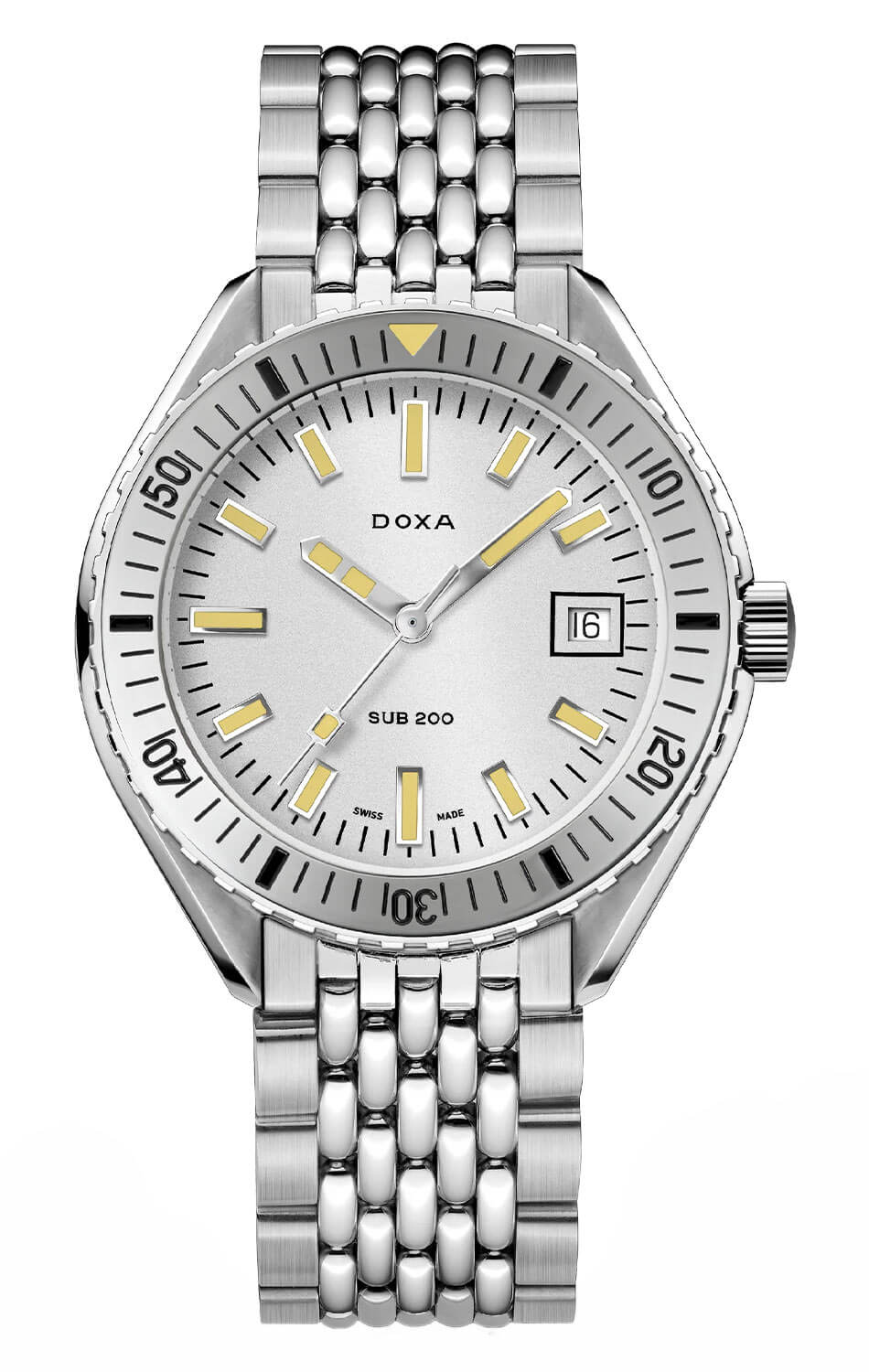 Pod szafirowym szkłem znajduje się srebrna tarcza – odcień, który pozwoli błyskawicznie odczytać aktualny czas. Jej barwa zapewnia maksymalny kontrast i widoczność pod wodą, a indeksy oraz wskazówki pokryte masą Super-LumiNova® pozostają czytelne nawet w ciemności. Na godzinie trzeciej umieszczono datownik w ramce, który nie zakłóca harmonii projektu. Zegarek nurkowy Doxa SUB Automatic 7961002110 na bransolecie to nie jest czasomierz do witryny – to rasowy diver gotowy do działania.