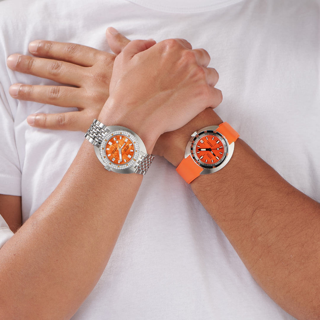 Szwajcarska marka zegarmistrzowska Doxa z dumą prezentuje wyjątkowy model z kolekcji SUB — zegarek Doxa SUB 200T Professional Diamonds 804.10D.351.10. To czasomierz nurkowy typu diver, stworzony z myślą o pasjonatach podwodnych przygód, zarówno profesjonalistach, jak i amatorach. Dzięki niezwykle czytelnej tarczy, trwałej konstrukcji oraz zastosowaniu najwyższej jakości materiałów, model ten idealnie sprawdzi się nawet w wymagających warunkach. Zachowując DNA legendarnego SUB'a z 1967 roku, zegarek oferuje nowoczesny wygląd, mniejszą średnicę koperty i wyjątkowe detale. Ozdobiony 107 białymi diamentami oraz 13 pomarańczowymi szafirami na obrotowej lunecie, łączy w sobie funkcjonalność z luksusem, przyciągając wzrok nie tylko pod wodą, ale i na lądzie.