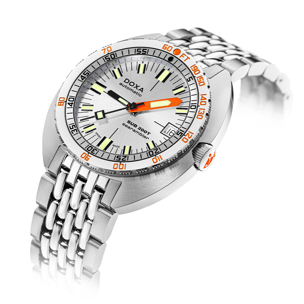 Marka DOXA zmodyfikowała projekt tarczy, aby osiągnąć bardziej współczesną obecność wizualną na nadgarstku. Chroniona przez odporne na zarysowania szkło szafirowe z powłoką antyrefleksyjną tarcza, oferowana jest w kolorze srebrnym. Wszystkie wskaźniki związane z nurkowaniem zostały nieco udoskonalone. Wskazówka minutowa jest powiększona, co ułatwia śledzenie upływającego czasu w chwili zanurzenia. Skala głębokości nałożona na opatentowanej, obrotowej lunecie w połączeniu ze wskazówkami, to nie tylko doskonała czytelność, ale dbałość o bezpieczeństwo każdego nurka. Wskazówki, jak i indeksy posiadają powłokę Super-LumiNova® dla optymalnej czytelności nawet w warunkach słabego oświetlenia. Męski zegarek Doxa SUB 200T to stylowy, sportowy i solidny czasomierz dla wyrafinowanego Pana. Będzie on doskonałym uzupełnieniem każdej eleganckiej i sportowej garderoby.