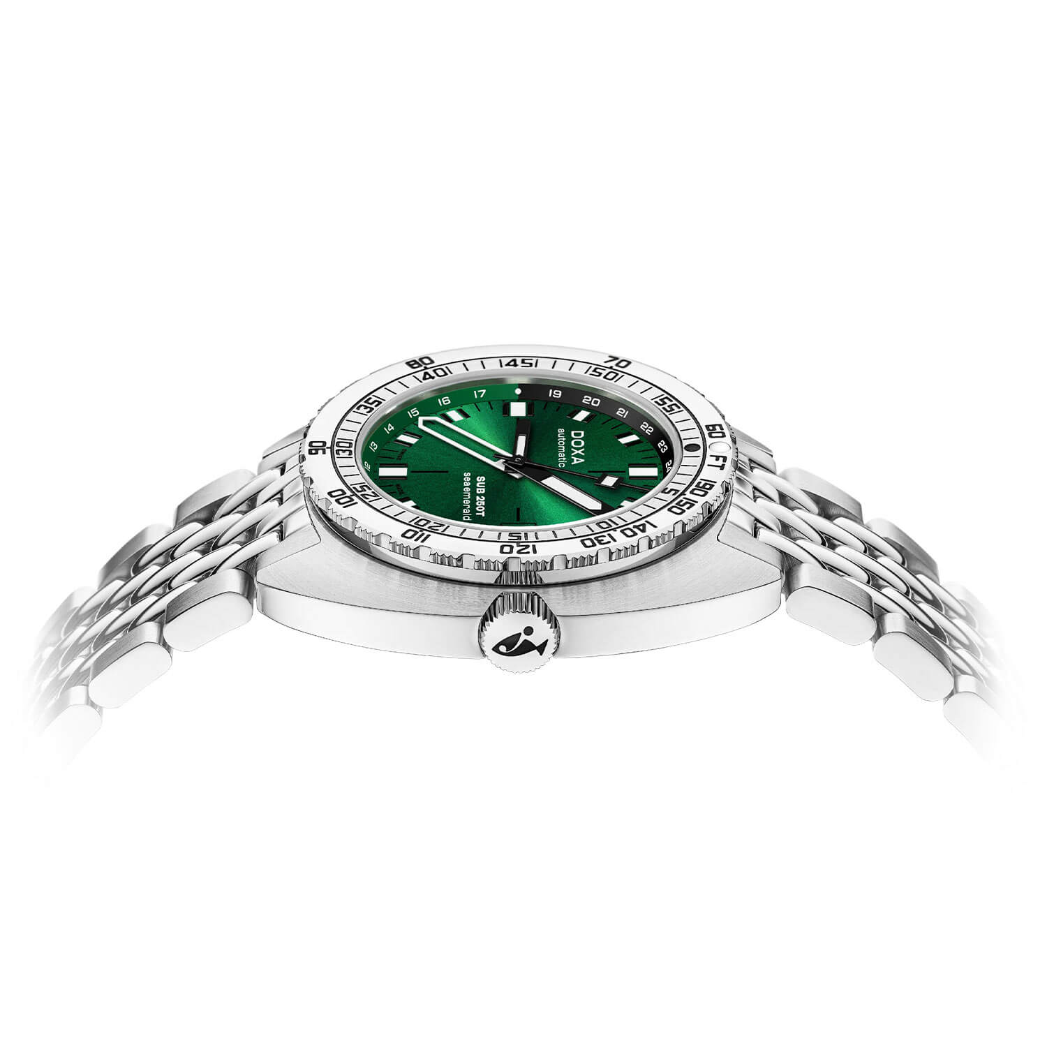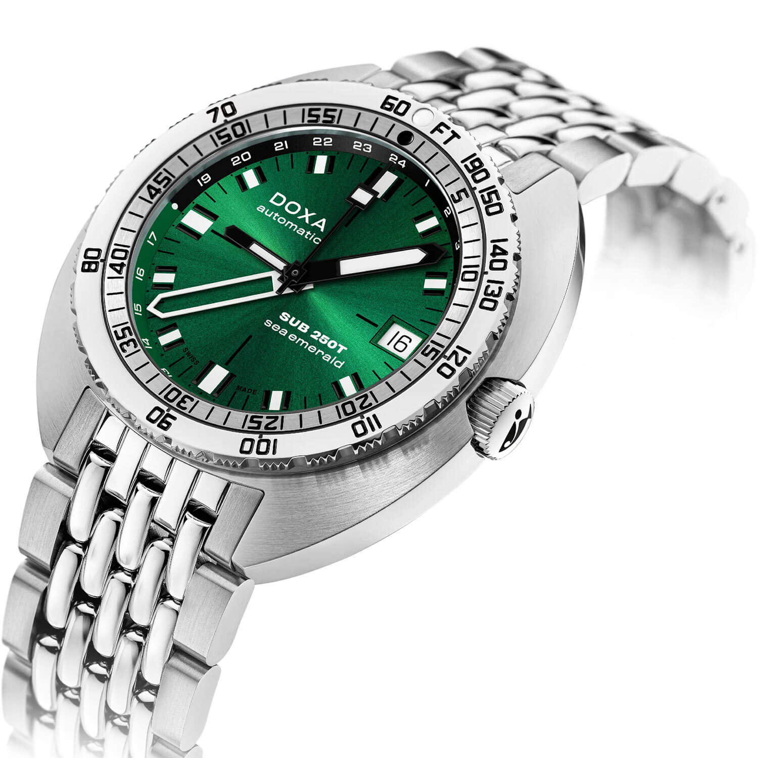 Butelkowozielona tarcza, typowa dla wersji Sea Emerald, to znak rozpoznawczy DOXA – stworzony z myślą o maksymalnym kontraście i czytelności pod wodą. Wyraźne indeksy i wskazówki z powłoką Super-LumiNova® zachowują świetną widoczność w ciemnych głębinach. Smukła wskazówka GMT oraz okienko datownika na godzinie trzeciej pozwalają śledzić równolegle dwa czasy – w domu i na miejscu eksploracji. Wszystko to zamknięte w formie, która łączy czystość funkcji z nurkowym charakterem.