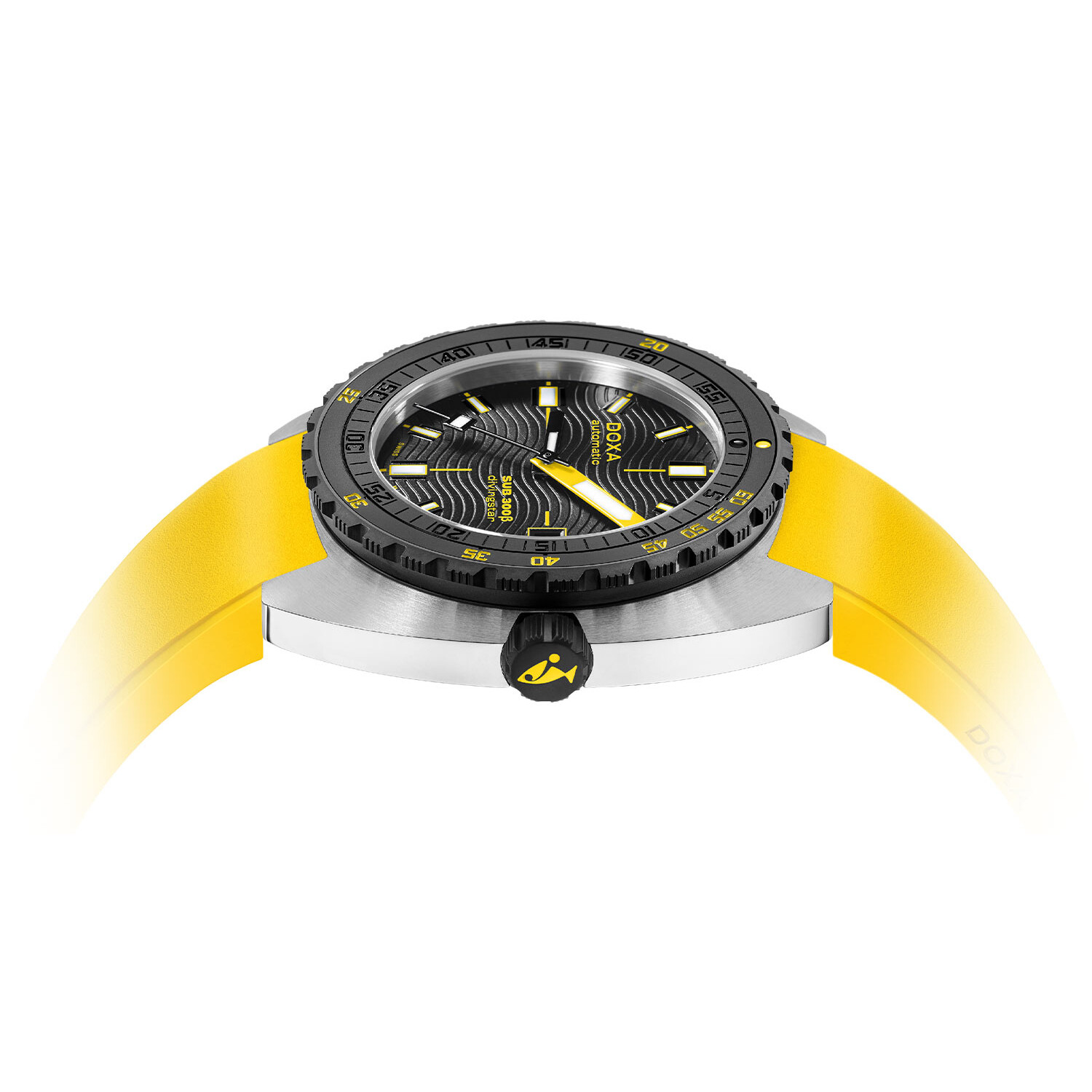 Zachowując średnicę 42.5 mm, DOXA subtelnie zmodyfikowała projekt koperty tonneau, by uczynić go smuklejszym, zaledwie 11.95 mm (w porównaniu do 13.65 mm w modelu SUB 300T), oraz zmniejszyła wysokość lunety o 0.5 mm. Efektem jest model o lżejszych, bardziej współczesnych proporcjach. Stalowa koperta utrzymuje funkcjonalną integralność zegarka, a czarna ceramiczna luneta i śrubowa koronka potwierdzają jego sportowo-szykowny charakter. Czasomierz nurkowy Doxa wyposażony jest w pasek z gumy FKM w kolorze żółtym. Pasek posiada zapięcie z zatrzaskiem z przedłużeniem do noszenia pod skafandrem oraz ikoniczny symbol "DOXA Fish". Z wodoszczelnością 30 ATM, czyli około 300 metrów, zegarek został zaprojektowany do eksploracji morskich głębin z zachowaniem pełnej bezpieczeństwa. Ważnym elementem wzmacniającym tego męski zegarek nurkowy DOXA SUB jest automatyczny zawór helowy.
