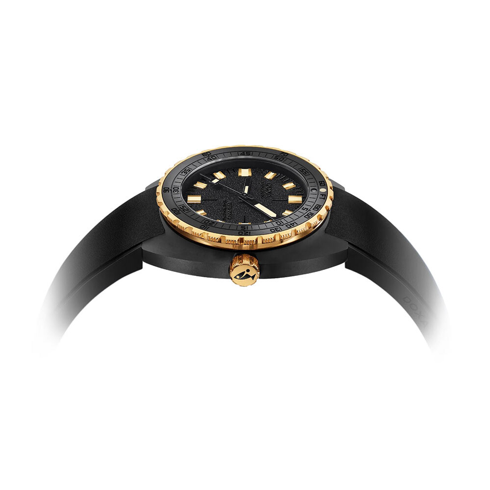 W efekcie narodziła się ekstrawagancja z wyczuciem proporcji i wyborem materiałów, które spajają zegarek ze współczesnością. Mająca beczułkowatą linię czarna koperta wykonana została z lekkiego i wytrzymałego tytanu. Matowy bezel ze skalą mierzoną w stopach powstał z ceramiki. Matową tarczę wyróżnia ziarnista faktura z czarnymi oznaczeniami i olśniewający kontrast z kluczowymi informacjami, które dostarczają wskazówki i indeksy oraz funkcjonalne elementy ramki i koronki stworzone z 18-karatowego 3N złota. Całość znajduje się pod osłoną odpornego na zarysowania szkła szafirowego. Niezawodność w odmierzaniu czasu gwarantuje szwajcarski mechanizm mechaniczny o automatycznym naciągu certyfikowany jako chronometr COSC. Za unikalne jego zdobienie odpowiada DOXA. Automatyczny zegarek z COSC DOXA SUB 300β Sharkhunter jest wyposażony w czarny gumowy pasek z wysokiej jakości gumy FKM zapewniający wyjątkowo wygodne dopasowanie.
