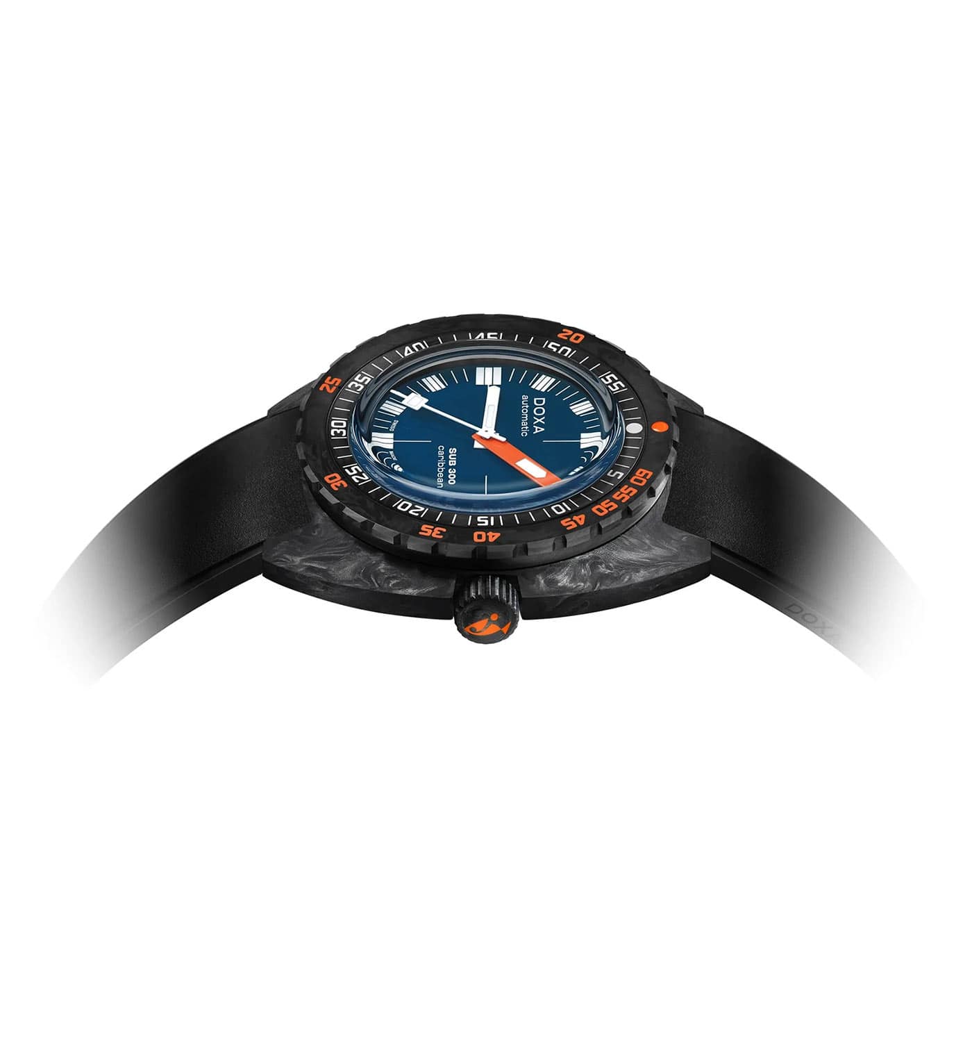 Doxa SUB 300 CARBON to ultralekki, profesjonalny zegarek do nurkowania na nadgarstek, oferujący fascynującą fuzję najnowocześniejszej technologii oraz estetyki przeniesionej z legendarnego i przełomowego modelu SUB 300. Wszystkie czasomierze z kolekcji Doxy SUB 300 CARBON wyróżniają się obudową z kutego włókna węglowego, tytanową komorą zapewniającą odporność na nacisk, a także bardzo funkcjonalną tarczą i dopasowanym kolorystycznie paskiem z gumy FKM.