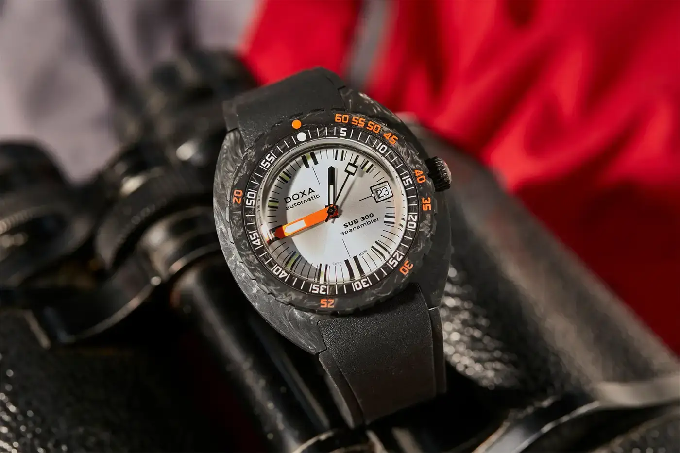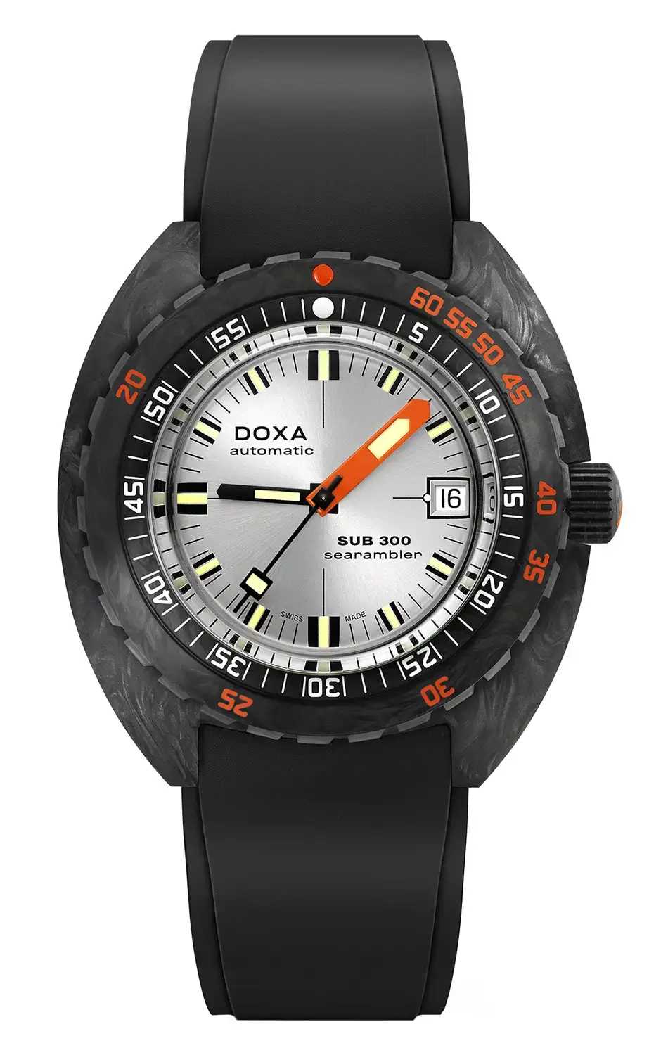 Doxa SUB 300 CARBON to ultralekki, profesjonalny zegarek do nurkowania na nadgarstek, oferujący fascynującą fuzję najnowocześniejszej technologii oraz estetyki przeniesionej z legendarnego i przełomowego modelu SUB 300. Wszystkie czasomierze z kolekcji Doxy SUB 300 CARBON wyróżniają się obudową z kutego włókna węglowego, tytanową komorą zapewniającą odporność na nacisk, a także bardzo funkcjonalną tarczą i dopasowanym kolorystycznie paskiem z gumy FKM.