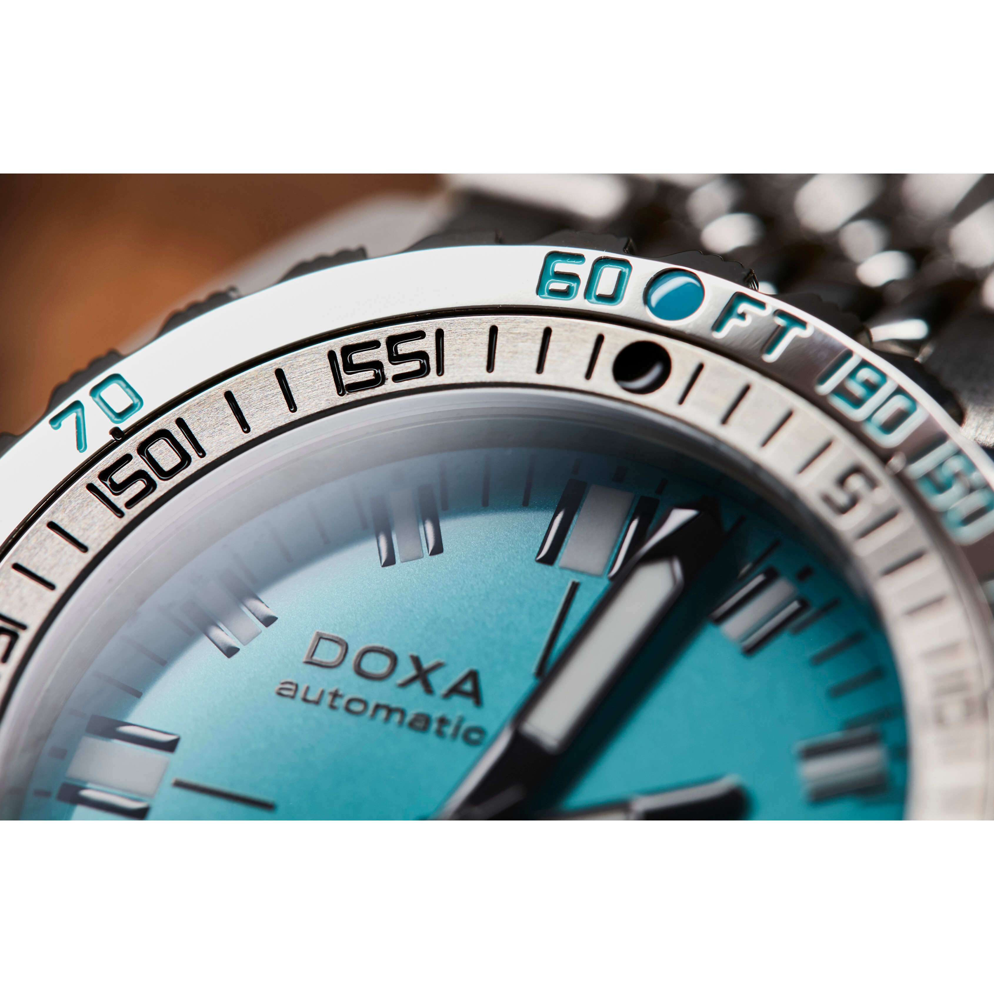 Automatyczny zegarek do nurkowania z trzema wskazówkami Doxa Aquamarine 840.10.241.10 scala estetyczne geny SUB 300T Conquistador z technicznymi udoskonaleniami definiującymi współczesne wysokowydajne zegarki typu diver. Wykonany ze stali nierdzewnej 316L, SUB 300T posiada średnicę 42.5 mm, a także odporne na zarysowania szkło szafirowe z powłoką antyrefleksyjną. Polerowana i szczotkowana przedłużana bransoleta w stylu „oddzielne koraliki ryżu” jest przymocowana śrubami, aby zagwarantować bezpieczne dopasowanie. Zegarek nurkowy z przedłużaną bransoletą Doxa SUB 300T zapina się na nadgarstku przy pomocy składanego zapięcia umożliwiającego dopasowanie go do nadgarstka w skafandrze nurkowym. Zapięcie oraz zakręcaną koronkę zdobi ekskluzywne logo DOXA fish. Całość zasila szwajcarski mechanizm mechaniczny o automatycznym naciągu zapewniający rezerwę chodu do około 38 godzin.