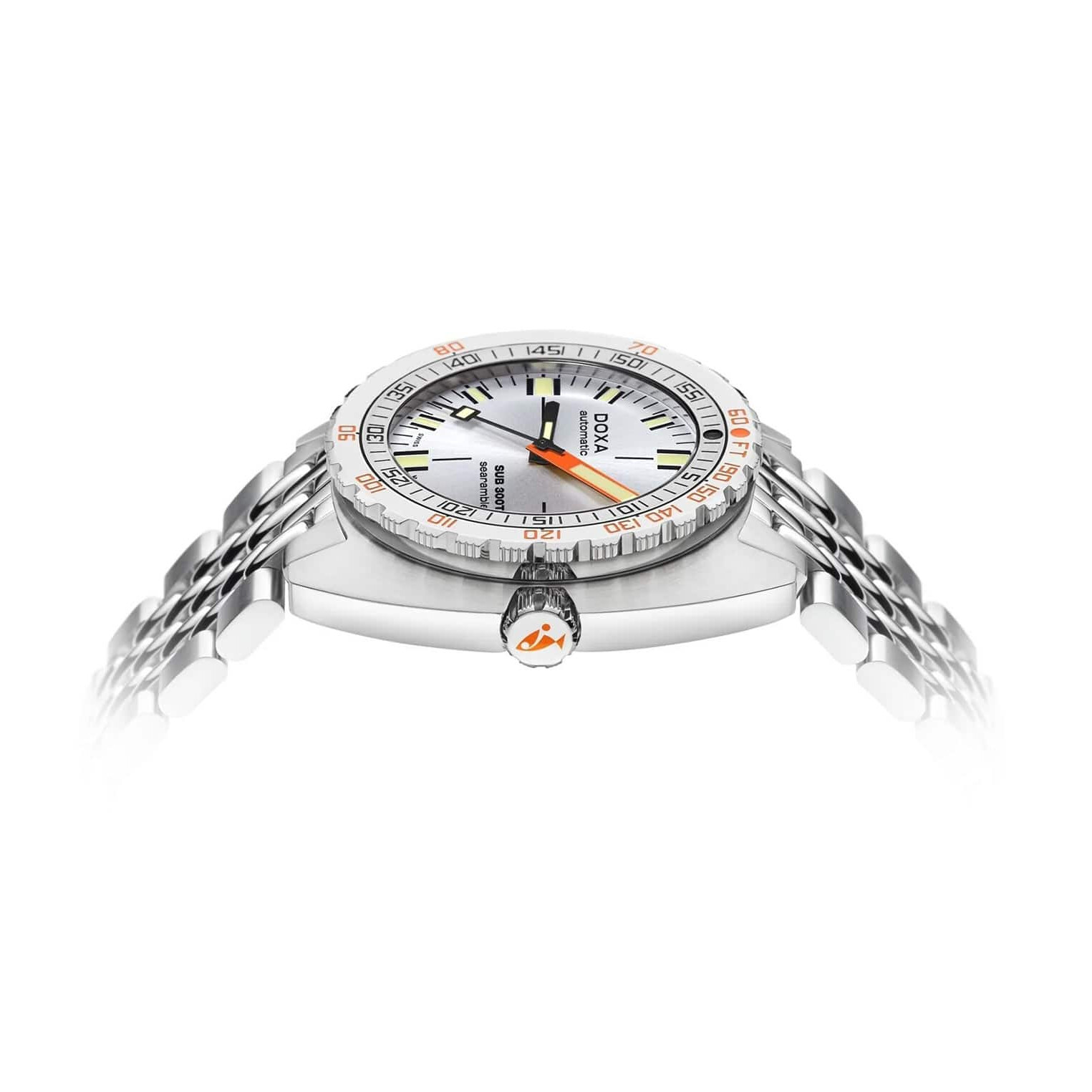 Automatyczny zegarek do nurkowania z trzema wskazówkami Doxa Searambler 840.10.021.10 scala estetyczne geny SUB 300T Conquistador z technicznymi udoskonaleniami definiującymi współczesne wysokowydajne zegarki typu diver. Wykonany ze stali nierdzewnej 316L, SUB 300T posiada średnicę 42.5 mm, a także odporne na zarysowania szkło szafirowe z powłoką antyrefleksyjną. Polerowana i szczotkowana przedłużana bransoleta w stylu „oddzielne koraliki ryżu” jest przymocowana śrubami, aby zagwarantować bezpieczne dopasowanie. Zegarek nurkowy z przedłużaną bransoletą Doxa SUB 300T zapina się na nadgarstku przy pomocy składanego zapięcia umożliwiającego dopasowanie go do nadgarstka w skafandrze nurkowym. Zapięcie oraz zakręcaną koronkę zdobi ekskluzywne logo DOXA fish. Całość zasila szwajcarski mechanizm mechaniczny o automatycznym naciągu zapewniający rezerwę chodu do około 38 godzin.