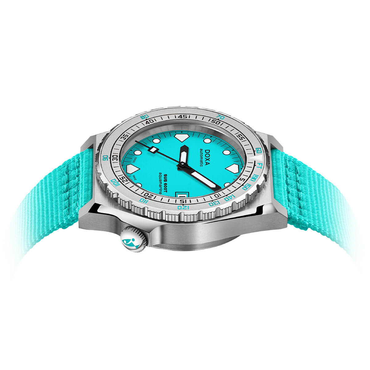 Każdy element modelu Doxa SUB 600T Divingstar NATO został zaprojektowany tak, by sprostać wyzwaniom głębin. Koperta o średnicy 40 mm wykonana jest z odpornej na korozję stali nierdzewnej 316L, co gwarantuje wytrzymałość nawet w surowych warunkach morskich ekspedycji. Pod szafirowym szkłem mieści się wyrazista tarcza, w jasnoniebieskim kolorze. Jego duże indeksy i wskazówki pokryto luminescencyjną powłoką Super-LumiNova® – w tym charakterystyczne znaczniki w kształcie zębów rekina na pozycjach 6, 9 i 12 – co zapewnia znakomitą czytelność w ciemności i pod wodą. Jednokierunkowy, obrotowy pierścień nurkowy z oznaczeniami minut i głębokości umożliwia łatwe i precyzyjne odmierzanie czasu zanurzenia i bezpieczne planowanie wynurzenia bez dekompresji. Rozwiązanie to stanowi ukłon w stronę oryginalnego patentu Doxy, który wspierał nurków w bezpiecznym powrocie na powierzchnię. Dzięki zakręcanej koronce (umieszczonej nietypowo na godzinie 4) oraz solidnej konstrukcji zegarek pozostaje szczelny do imponujących 600 metrów (60 ATM), dając użytkownikowi pewność i duży zapas bezpieczeństwa, powyżej standardowych wymagań.