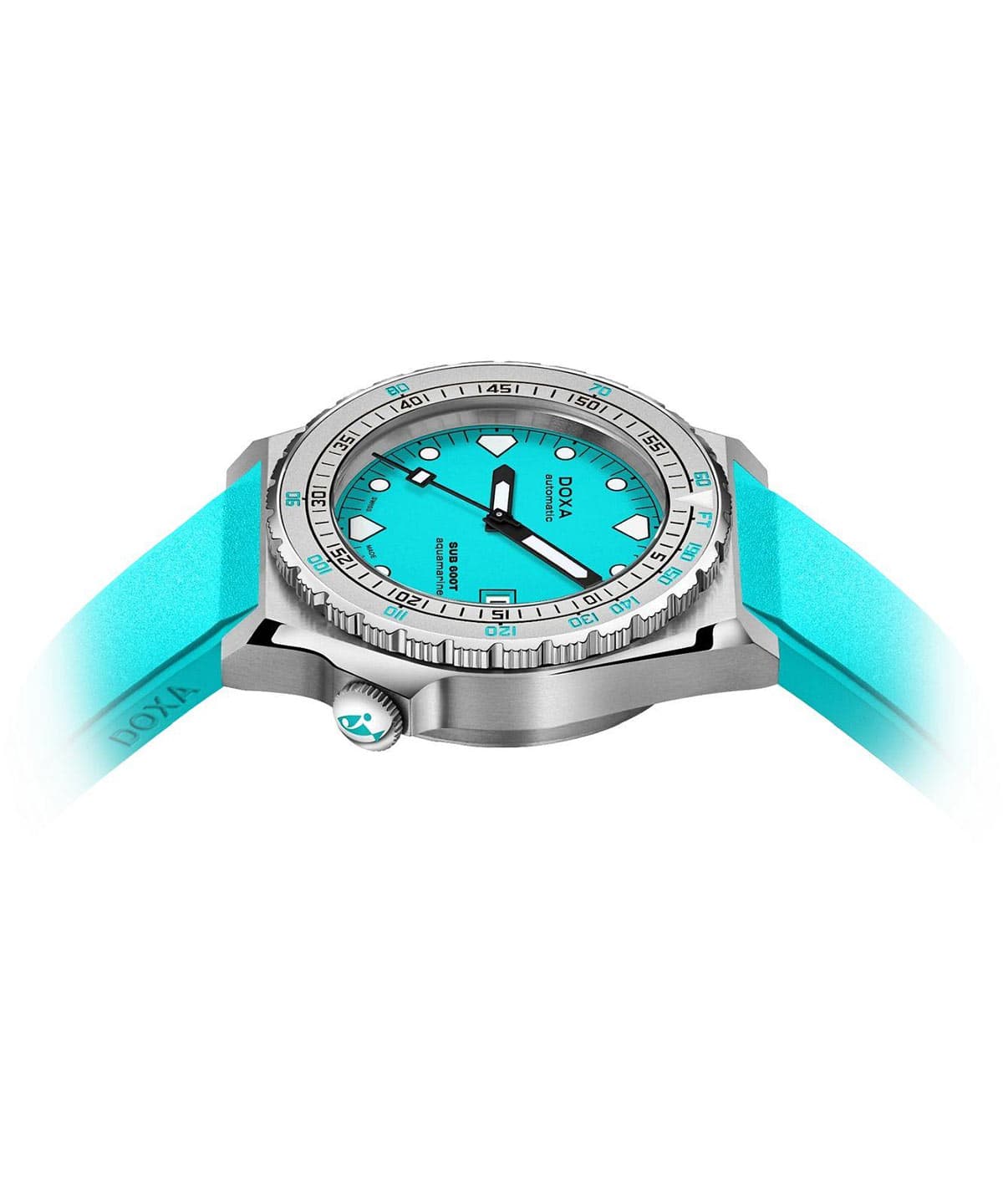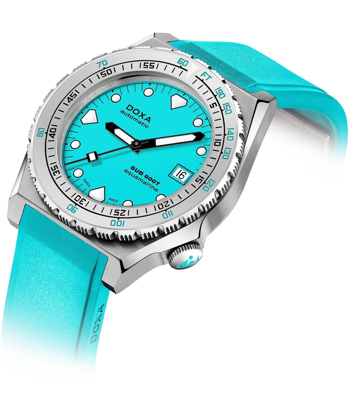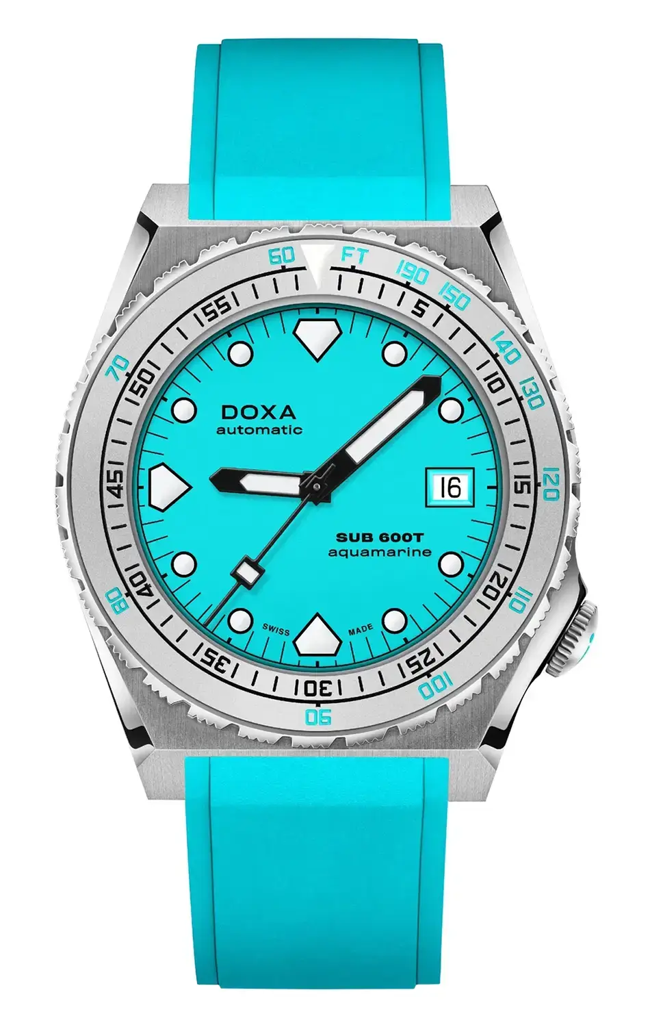 DOXA SUB 600T odradza się w 2021 roku — ponad 40 lat później i czyni coś więcej niż tylko powrócenie do rozdziału napisanego dużo wcześniej. Marka oddaje hołd kultowemu modelowi SUB 600T z nową historią, która tworzy się właśnie teraz. Po wielkim sukcesie limitowanej edycji zegarka nurkowego z tytanu Doxa SUB 600T Pacific Blue DOXA przedstawia SUB 600T w nielimitowanej wersji, aby wzbogacić linię profesjonalnych zegarków do nurkowania DOXA SUB. Odrodzony zegarek diver Doxa SUB 600T Aquamarine to model dostępny w wytrzymałej obudowie ze stali nierdzewnej 316L, z turkusowym paskiem z wysokiej jakości gumy FKM oraz ze stalową ramką o piaskowanym wykończeniu, w środku której znajduje się czytelna, turkusowa tarcza.