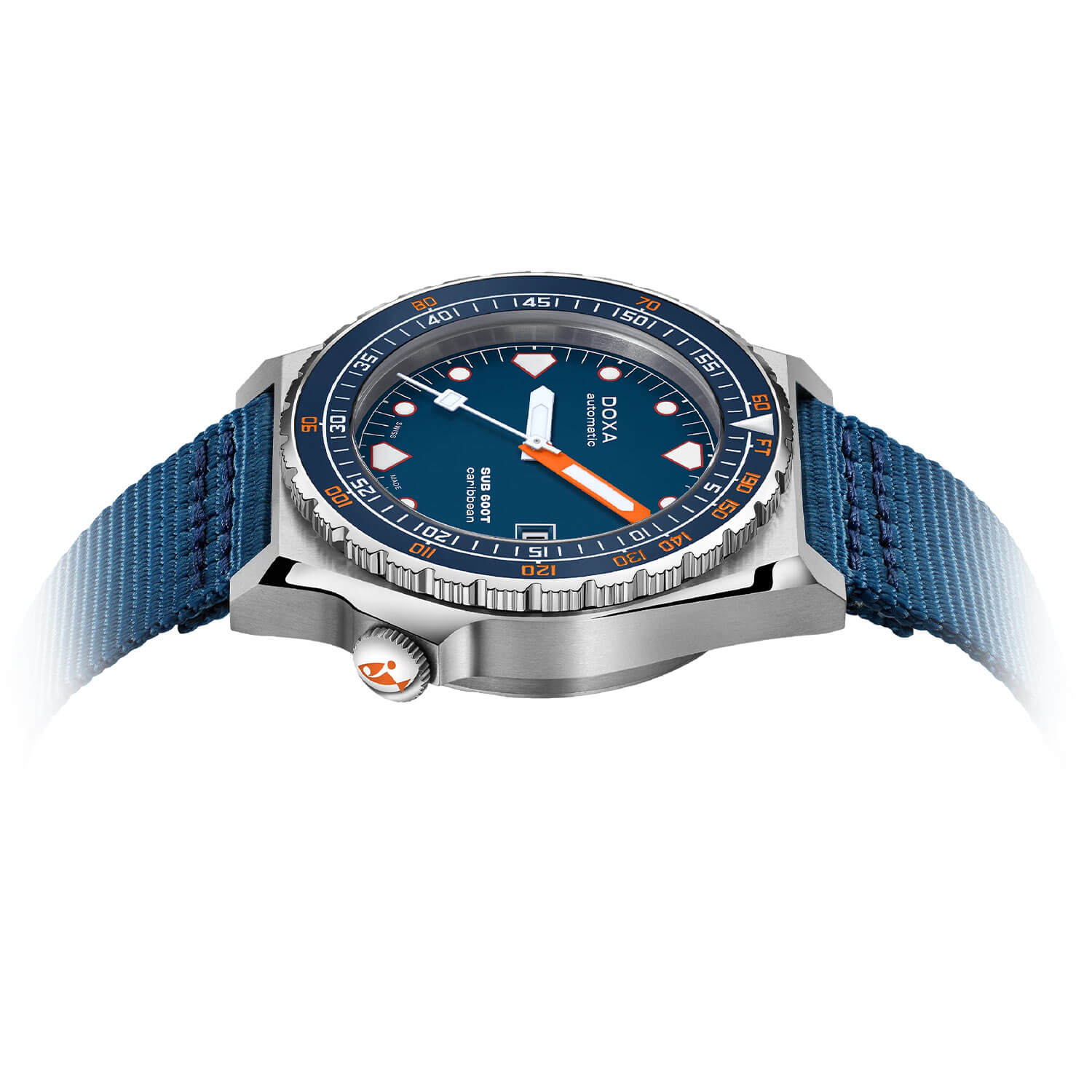 40-milimetrowa koperta wykonana została ze szczotkowanej stali szlachetnej 316L, a zakręcana koronka usytuowana na godzinie 4 zwiększa komfort i bezpieczeństwo podczas użytkowania pod wodą. Obudowę zamknięto od góry wypukłym szkłem szafirowym z powłoką antyrefleksyjną, które zabezpiecza mechanizm przy ciśnieniu do 600 metrów. Jednokierunkowy bezel z czarną ceramiczną wkładką i podwójną skalą (minuty i głębokość w stopach) umożliwia precyzyjne wyznaczenie czasu zanurzenia i kontrolę dekompresji. Model ten zestawiono z paskiem NATO w niebieskim kolorze – lekkim, odpornym na wodę i wygodnym nawet podczas wielogodzinnych nurkowań.