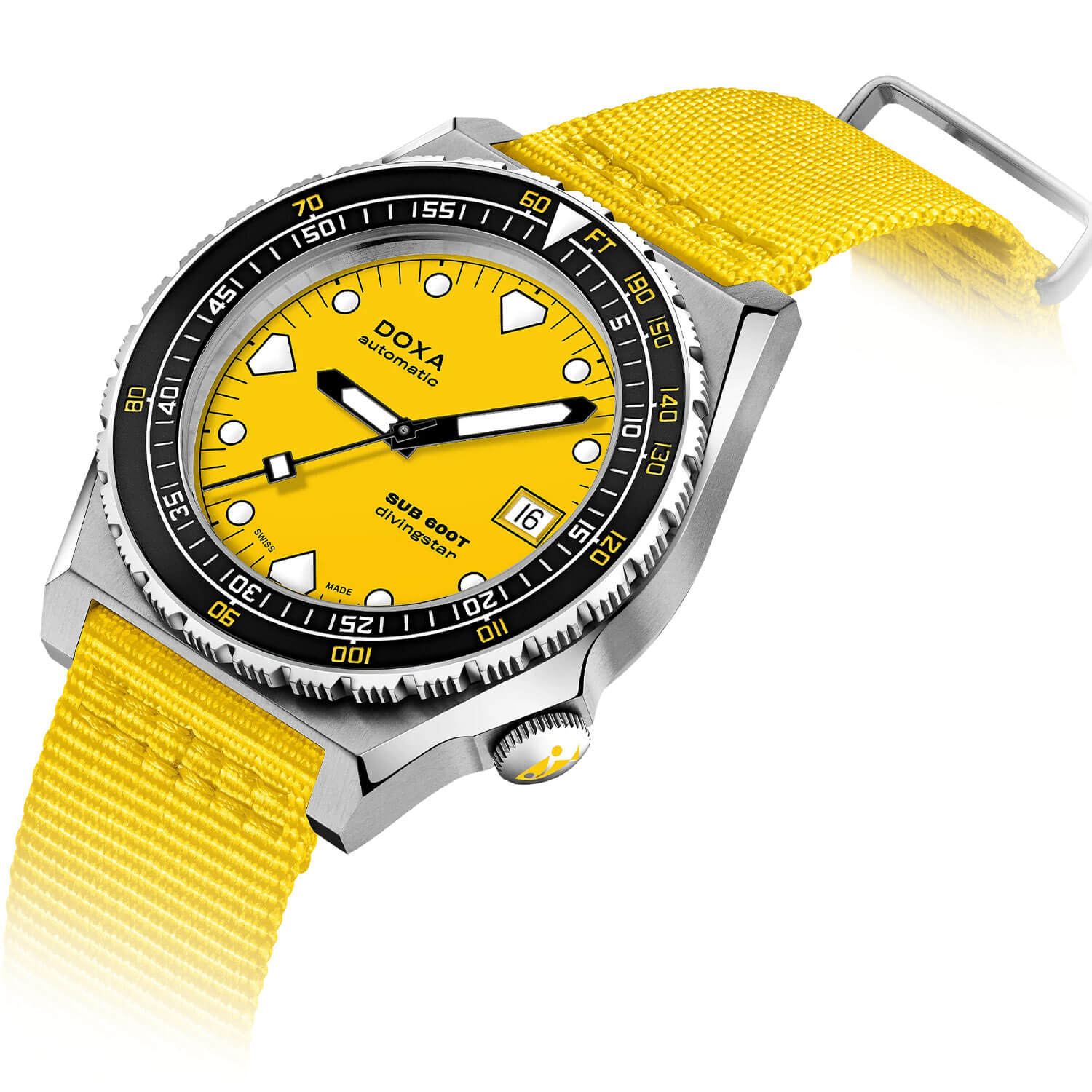 40-milimetrowa koperta wykonana została ze szczotkowanej stali szlachetnej 316L, a zakręcana koronka usytuowana na godzinie 4 zwiększa komfort i bezpieczeństwo podczas użytkowania pod wodą. Obudowę zamknięto od góry wypukłym szkłem szafirowym z powłoką antyrefleksyjną, które zabezpiecza mechanizm przy ciśnieniu do 600 metrów. Jednokierunkowy bezel z czarną ceramiczną wkładką i podwójną skalą (minuty i głębokość w stopach) umożliwia precyzyjne wyznaczenie czasu zanurzenia i kontrolę dekompresji. Model ten zestawiono z paskiem NATO w jaskrawożółtym kolorze – lekkim, odpornym na wodę i wygodnym nawet podczas wielogodzinnych nurkowań.