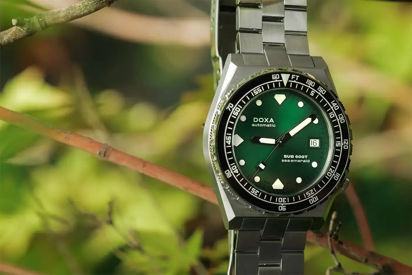 DOXA SUB 600T Sea Emerald 861.10.131.10 to profesjonalny zegarek nurkowy, który wiernie oddaje ikoniczny styl lat 80., jednocześnie spełniając współczesne wymagania nurków i miłośników wytrzymałych czasomierzy. SUB 600T Sea Emerald, charakteryzujący się klasycznym designem DOXA, oferuje nowość w postaci tarczy i paska w odcieniu Sea Emerald z eleganckim wykończeniem sunburst, która przepięknie odbija światło, tworząc hipnotyzujące efekty świetlne. Ten głęboki, morski odcień zieleni symbolizuje więź DOXA z oceanami i przywołuje obrazy fal oraz podwodnych krajobrazów z różnych zakątków świata.