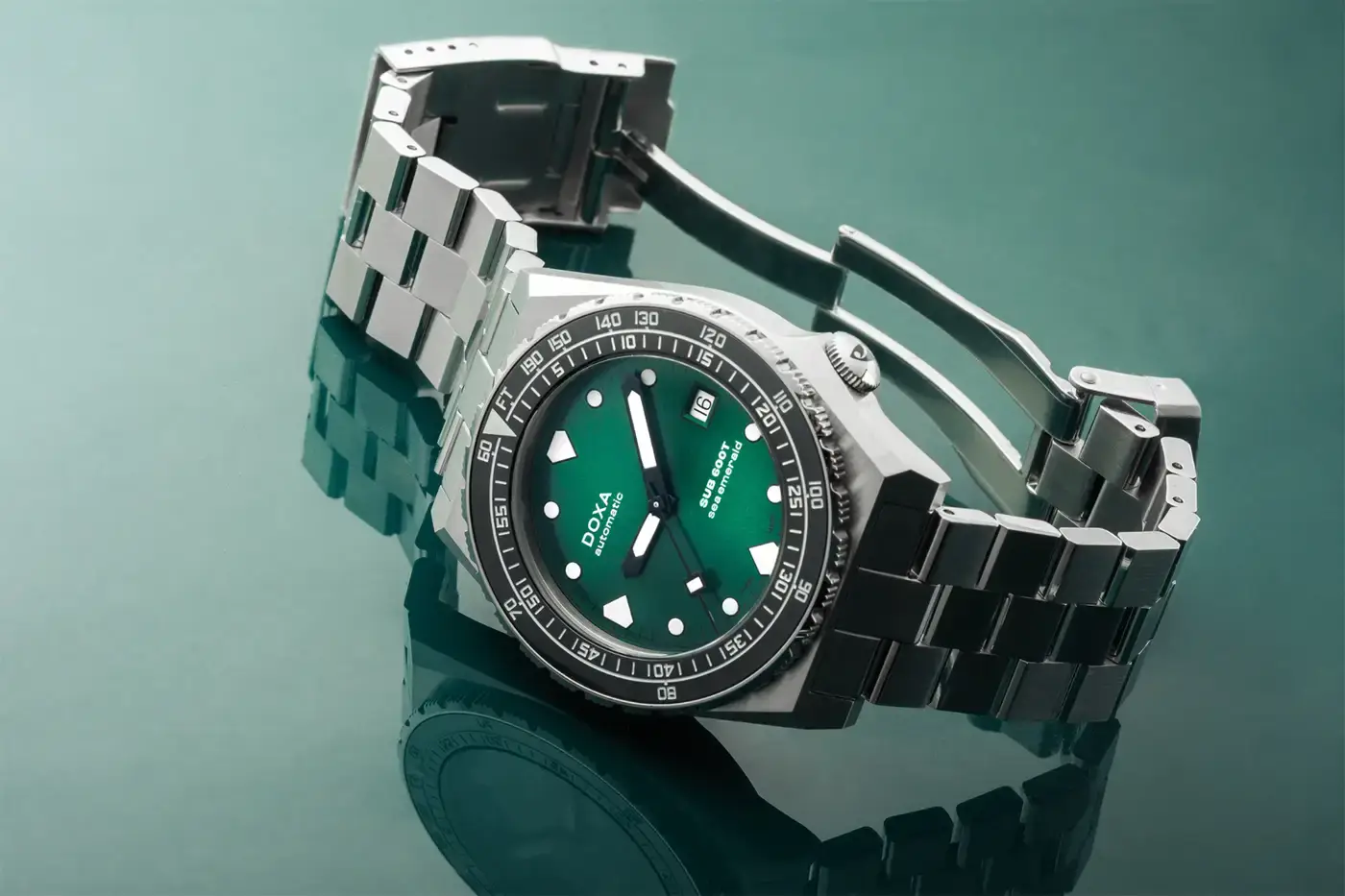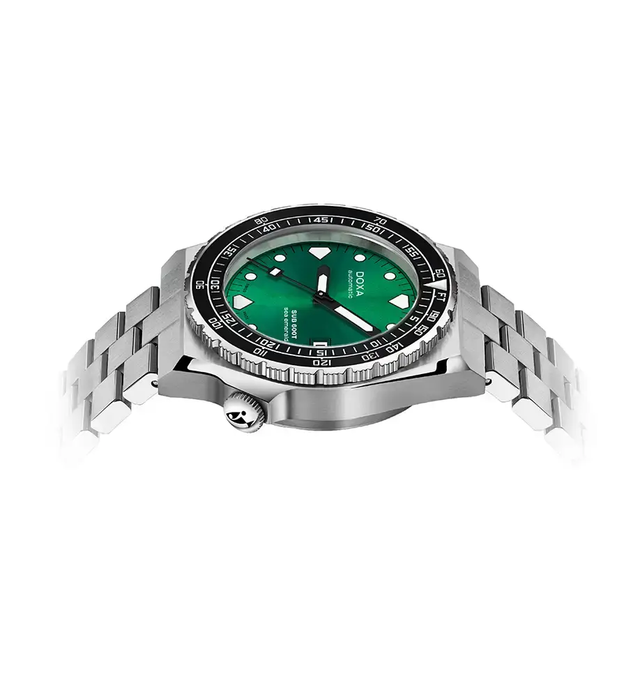 Zegarek męski Doxa SUB 600T Sea Emerald napędza udekorowany przez DOXA szwajcarski mechanizm automatyczny z około 38-godzinną rezerwą chodu i częstotliwością 28 800 vph, (4,0 Hz) co gwarantuje precyzję i płynne działanie. Model SUB 600T Sea Emerald dostępny jest na trzyrzędowej bransolecie ze nierdzewnej stali, wyposażonej w składane zapięcie z opcją regulacji, która umożliwia dopasowanie zegarka do nadgarstka w piance lub skafandrze. Zegarek ten łączy nowoczesną funkcjonalność z nutą vintage, co sprawia, że jest idealnym wyborem dla tych, którzy cenią wyjątkowy styl oraz niezawodność w wymagających warunkach.