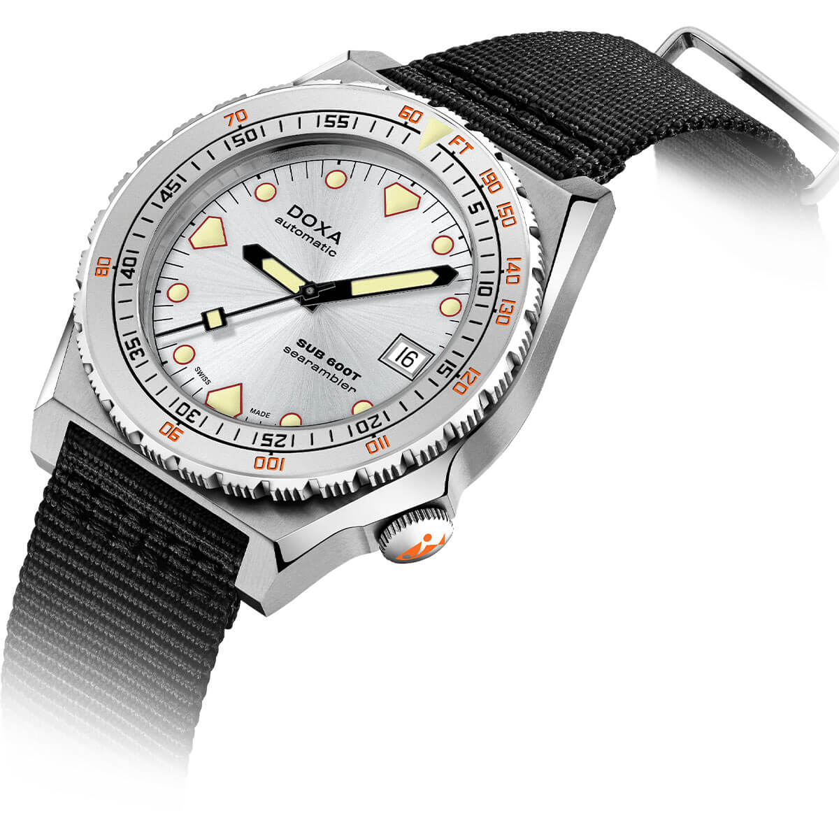 Każdy element modelu Doxa SUB 600T Searambler NATO został zaprojektowany tak, by sprostać wyzwaniom głębin. Koperta o średnicy 40 mm wykonana jest z odpornej na korozję stali nierdzewnej 316L, co gwarantuje wytrzymałość nawet w surowych warunkach morskich ekspedycji. Pod szafirowym szkłem mieści się wyrazista tarcza, w jasnym kolorze. Jego duże indeksy i wskazówki pokryto luminescencyjną powłoką Super-LumiNova® – w tym charakterystyczne znaczniki w kształcie zębów rekina na pozycjach 6, 9 i 12 – co zapewnia znakomitą czytelność w ciemności i pod wodą. Jednokierunkowy, obrotowy pierścień nurkowy z oznaczeniami minut i głębokości umożliwia łatwe i precyzyjne odmierzanie czasu zanurzenia i bezpieczne planowanie wynurzenia bez dekompresji. Rozwiązanie to stanowi ukłon w stronę oryginalnego patentu Doxy, który wspierał nurków w bezpiecznym powrocie na powierzchnię. Dzięki zakręcanej koronce (umieszczonej nietypowo na godzinie 4) oraz solidnej konstrukcji zegarek pozostaje szczelny do imponujących 600 metrów (60 ATM), dając użytkownikowi pewność i duży zapas bezpieczeństwa, powyżej standardowych wymagań.
