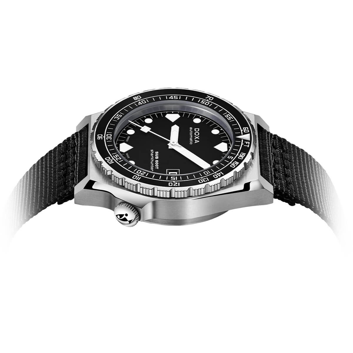 Każdy element modelu Doxa SUB 600T Sharkhunter NATO został zaprojektowany tak, by sprostać wyzwaniom głębin. Koperta o średnicy 40 mm wykonana jest z odpornej na korozję stali nierdzewnej 316L, co gwarantuje wytrzymałość nawet w surowych warunkach morskich ekspedycji. Pod szafirowym szkłem mieści się wyrazista tarcza, w charakterystycznym czarnym kolorze. Jego duże indeksy i wskazówki pokryto luminescencyjną powłoką Super-LumiNova® – w tym charakterystyczne znaczniki w kształcie zębów rekina na pozycjach 6, 9 i 12 – co zapewnia znakomitą czytelność w ciemności i pod wodą. Jednokierunkowy, obrotowy pierścień nurkowy z oznaczeniami minut i głębokości umożliwia łatwe i precyzyjne odmierzanie czasu zanurzenia i bezpieczne planowanie wynurzenia bez dekompresji. Rozwiązanie to stanowi ukłon w stronę oryginalnego patentu Doxy, który wspierał nurków w bezpiecznym powrocie na powierzchnię. Dzięki zakręcanej koronce (umieszczonej nietypowo na godzinie 4) oraz solidnej konstrukcji zegarek pozostaje szczelny do imponujących 600 metrów (60 ATM), dając użytkownikowi pewność i duży zapas bezpieczeństwa, powyżej standardowych wymagań.