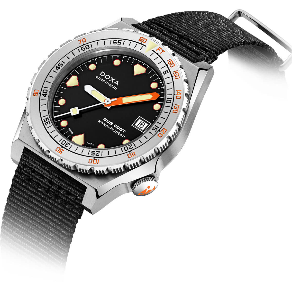 Każdy element modelu Doxa SUB 600T Sharkhunter NATO został zaprojektowany tak, by sprostać wyzwaniom głębin. Koperta o średnicy 40 mm wykonana jest z odpornej na korozję stali nierdzewnej 316L, co gwarantuje wytrzymałość nawet w surowych warunkach morskich ekspedycji. Pod szafirowym szkłem mieści się wyrazista tarcza, w charakterystycznym czarnym kolorze. Jego duże indeksy i wskazówki pokryto luminescencyjną powłoką Super-LumiNova® – w tym charakterystyczne znaczniki w kształcie zębów rekina na pozycjach 6, 9 i 12 – co zapewnia znakomitą czytelność w ciemności i pod wodą. Jednokierunkowy, obrotowy pierścień nurkowy z oznaczeniami minut i głębokości umożliwia łatwe i precyzyjne odmierzanie czasu zanurzenia i bezpieczne planowanie wynurzenia bez dekompresji. Rozwiązanie to stanowi ukłon w stronę oryginalnego patentu Doxy, który wspierał nurków w bezpiecznym powrocie na powierzchnię. Dzięki zakręcanej koronce (umieszczonej nietypowo na godzinie 4) oraz solidnej konstrukcji zegarek pozostaje szczelny do imponujących 600 metrów (60 ATM), dając użytkownikowi pewność i duży zapas bezpieczeństwa, powyżej standardowych wymagań.