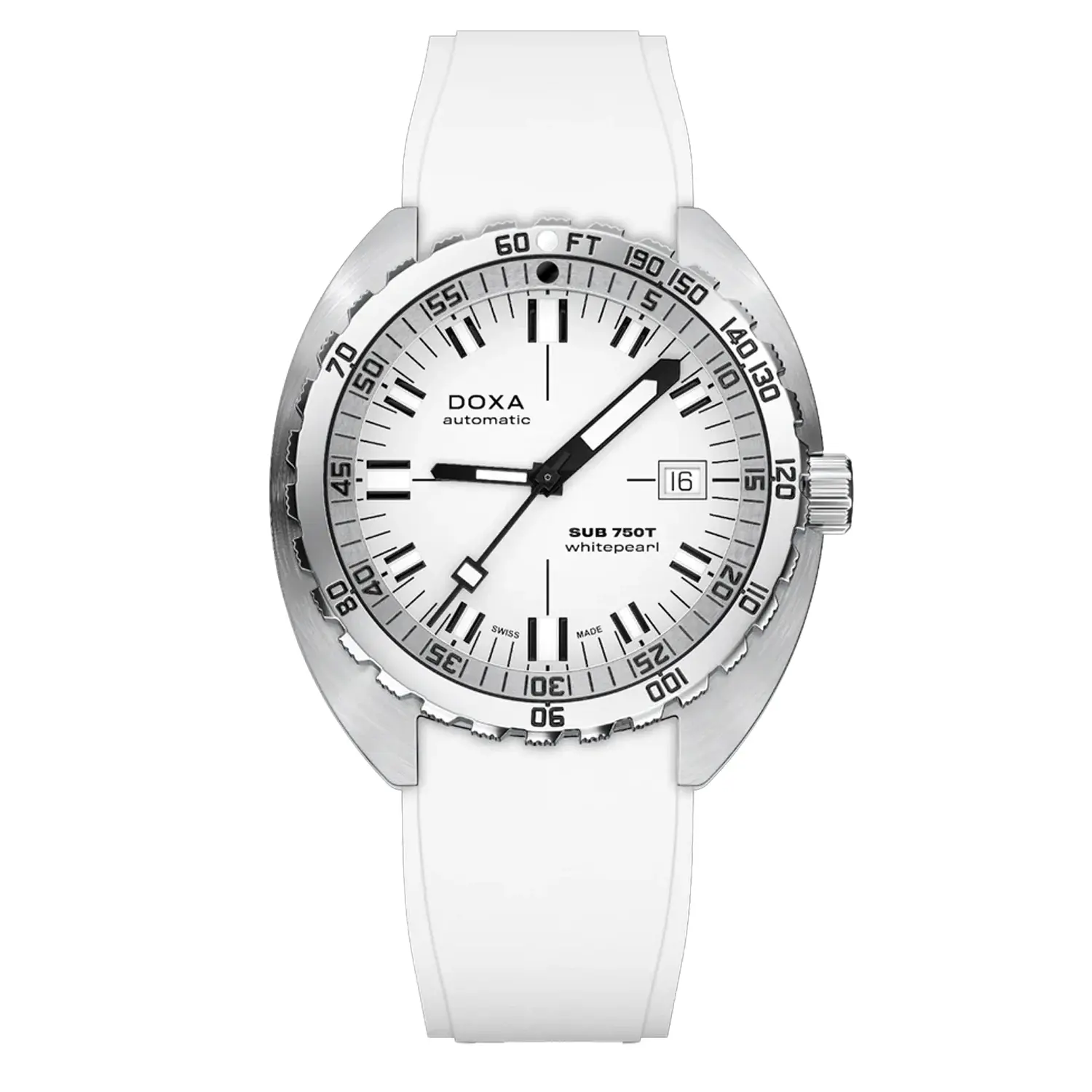 Doxa SUB 750T Whitepearl 825.10.011.23 to model, który łączy wyrazistą prostotę z profesjonalną funkcjonalnością. Biel tarczy wyróżnia go spośród klasycznych diverów, a pasek kauczukowy podkreśla jego sportowy charakter. To zegarek dla osób, które stawiają na niezawodność, a jednocześnie chcą, aby ich sprzęt nurkowy wyróżniał się w tłumie.