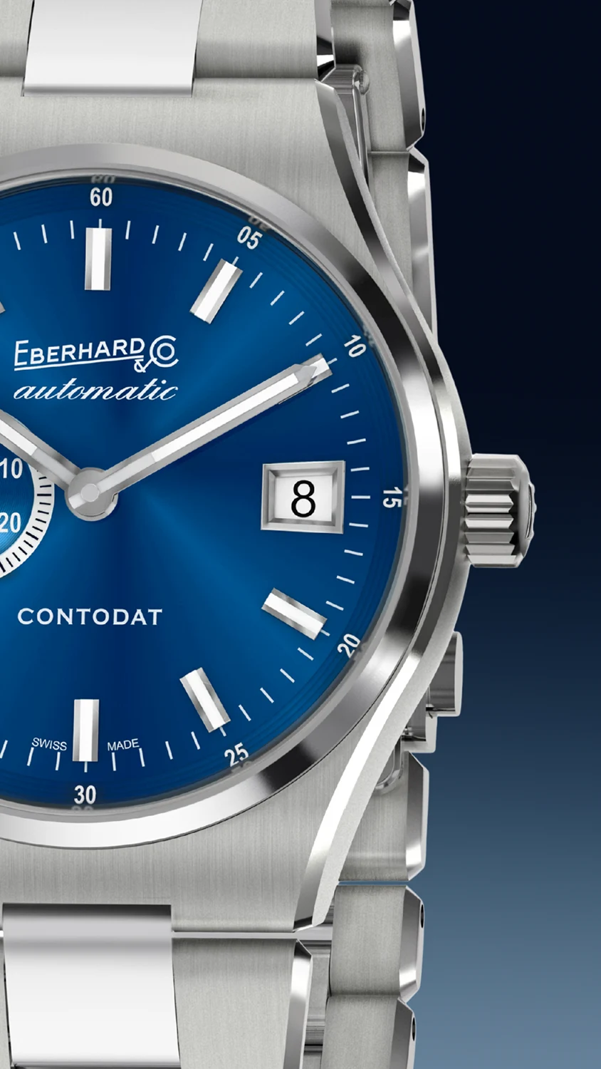 Niebieska tarcza o wykończeniu soleil przyciąga uwagę głębią koloru i lustrzanym połyskiem, który zmienia się w zależności od kąta padania światła. Uwagę zwraca mały sekundnik na godzinie dziewiątej z kontrastującą pomarańczową wskazówką – detal o silnym, dynamicznym charakterze, który wprowadza do klasycznej tarczy nutę nowoczesności. Na godzinie trzeciej umieszczono trapezoidalne okno daty – element zaczerpnięty z historycznych modeli Contodat, stanowiący subtelny hołd dla dziedzictwa marki.