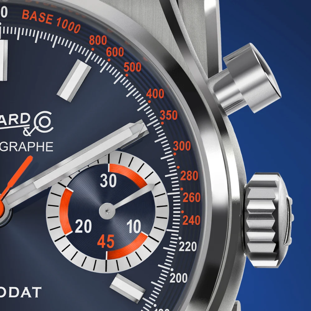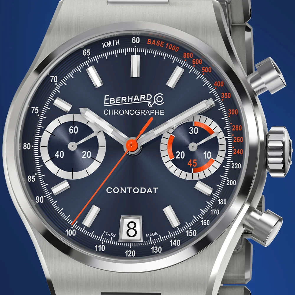 Chronograf Contodat wyróżnia się tarczą o wyjątkowej strukturze, w której zastosowano wykończenia soleil i azuré. Dzięki temu powierzchnia gra światłem, tworząc głębię i połysk, które ożywiają każdy detal. Subtelnie rozmieszczone liczniki zachowują idealną symetrię, a centralna pomarańczowa wskazówka chronografu wprowadza dynamiczny kontrast, symbolizując energię i precyzję pomiaru. Charakterystyczna skala 45-minutowa na liczniku minutowym przy godzinie trzeciej oraz trapezoidalne okno daty to wierne nawiązania do kultowego modelu z lat 70., które dziś nabierają współczesnego charakteru.