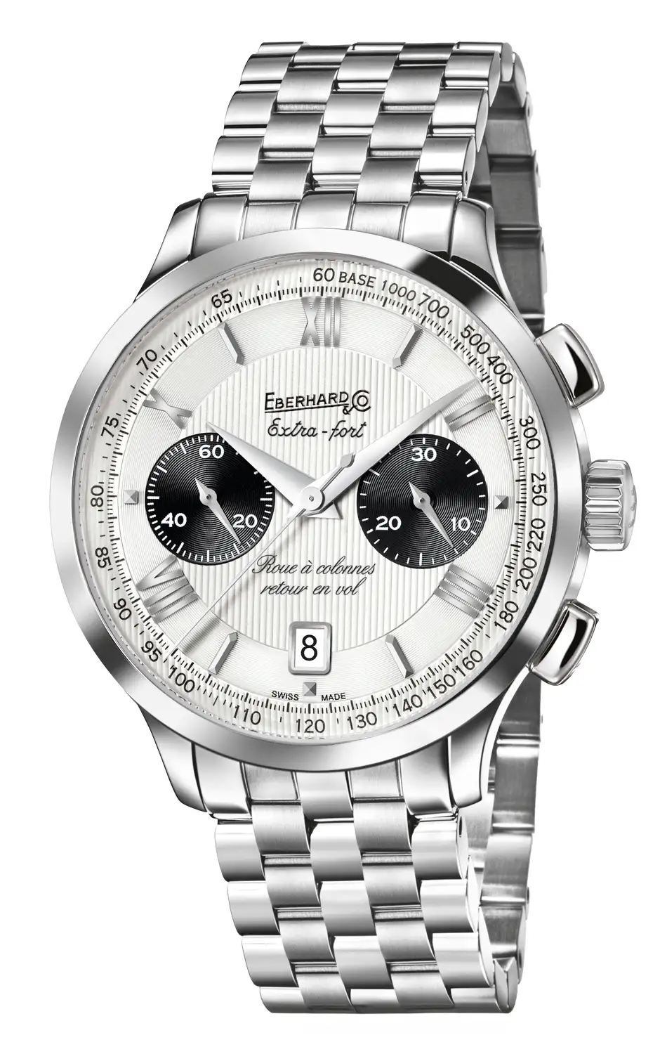 Eberhard Extra-Fort Roue à Colonnes Retour en Vol 31957.02 CA99 to chronograf automatyczny, który w wersji na stalowej bransolecie nabiera bardziej współczesnego i zdecydowanego charakteru. Klasyczna linia Extra-Fort pozostaje tu nienaruszona, jednak metalowe wykończenie podkreśla użytkowy wymiar zegarka, czyniąc go naturalnym wyborem do codziennego noszenia w eleganckim stylu.