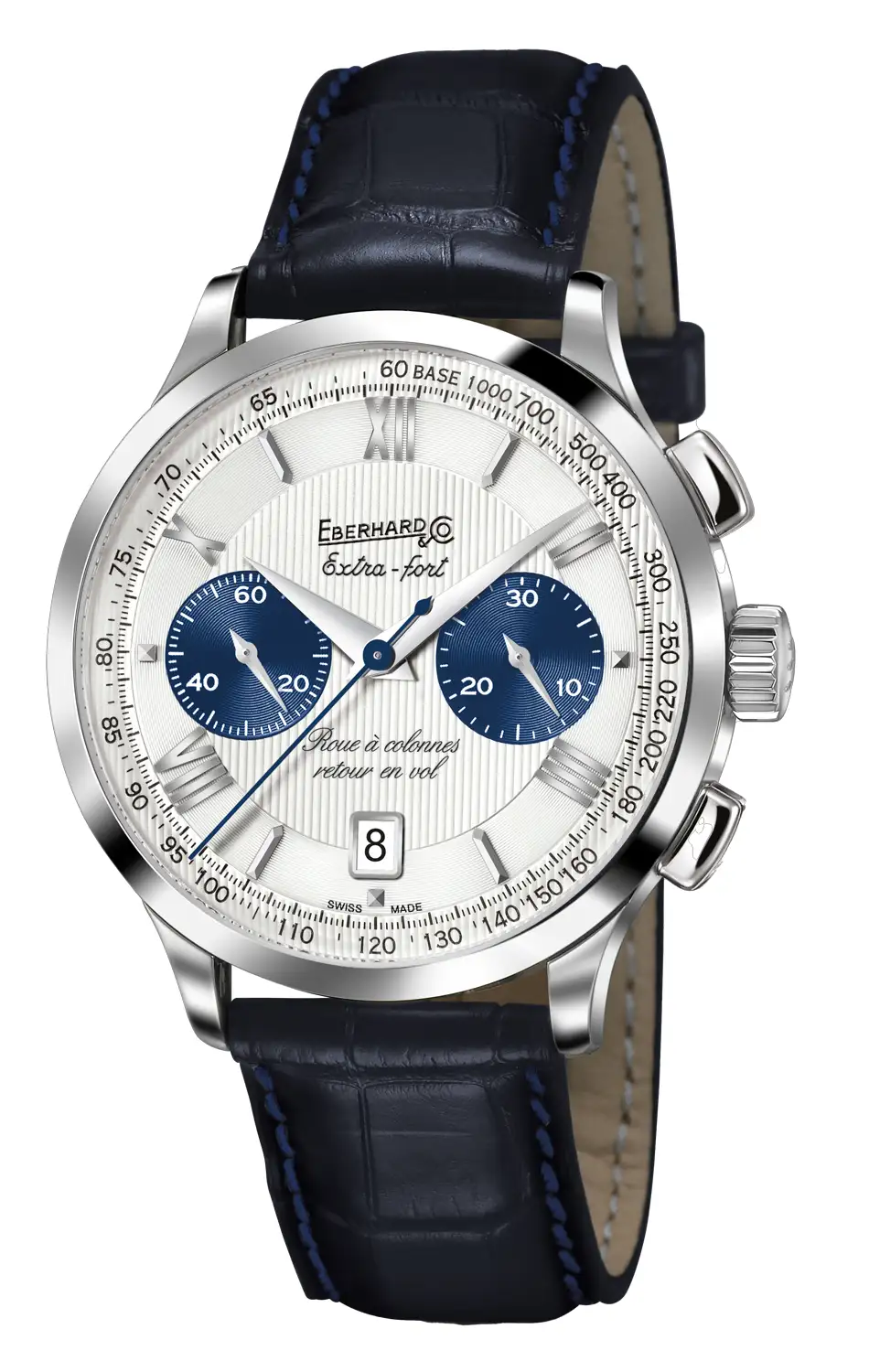 Eberhard Extra-Fort Roue à Colonnes Retour en Vol 31957.05 CP to propozycja dla osób, które w zegarku szukają harmonii pomiędzy klasyczną estetyką a wyrafinowaną funkcjonalnością. Jasna tarcza z pionowym szlifem delikatnie reaguje na światło, zmieniając swój charakter w zależności od otoczenia, a granatowe liczniki chronografu wprowadzają elegancki kontrast, który porządkuje kompozycję i przyciąga wzrok.