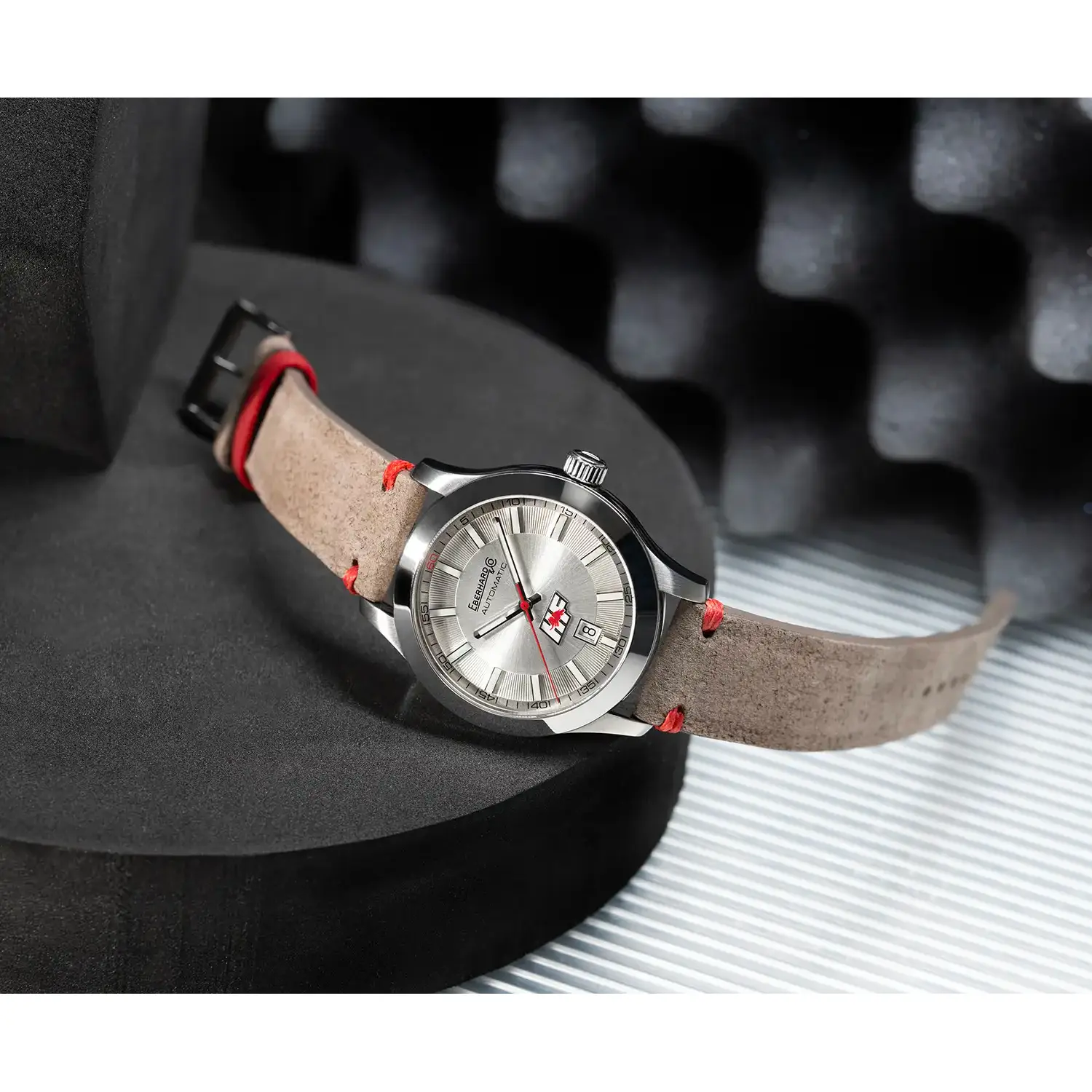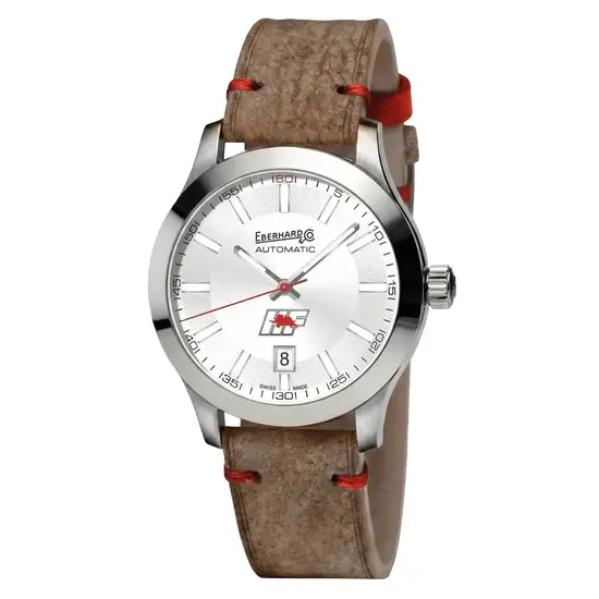 Wewnątrz pracuje mechaniczny mechanizm automatyczny Eberhard, ceniony za stabilność chodu i kulturę pracy. Zegarek zestawiono ze skórzanym paskiem w jasnobrązowym, beżowym odcieniu, stylizowanym na vintage. Czerwone przeszycia oraz kontrastowa czerwona szlufka nawiązują do kolorystyki logo HF, tworząc spójną i dopracowaną całość.