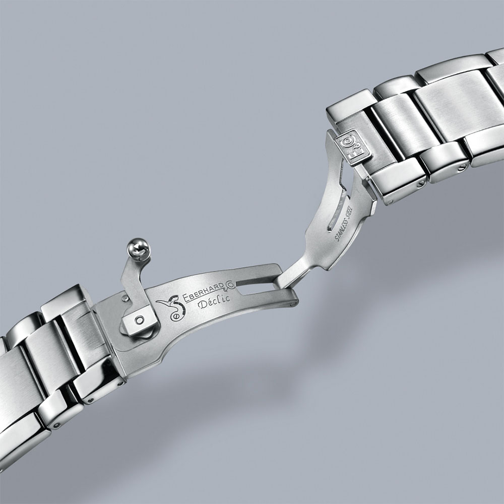 Obecny Eberhard Scafograf 300 41034.2 CAD to mechaniczny, samo nakręcający się zegarek nurkowy ze stali szlachetnej o średnicy koperty 43 mm. Obudowa z jednokierunkową obrotową ramka z wkładką z ceramiki, z luminescencyjnymi oznaczeniami przez pierwsze 15 minut. Wypukłe szkło szafirowe z powłoką antyrefleksyjną oraz automatyczny zawór helowy w kopercie na godzinie 9. Czarna tarcza „galbé” ma luminescencyjne indeksy i biały datownik na godzinie trzeciej. Nazwa modelu oraz centralnie umieszczony sekundnik są w kolorze niebieskim. Wskazówki godzin i minut również są wypełnione substancją luminescencyjną. Wodoszczelny do 30 barów/300 m dzięki zakręcanemu deklowi, który jest spersonalizowany grawerowaną rozgwiazdą. Model jest dostarczany z opatentowanym wzorem bransolety CHASSIS®. Wykonana ze stali szlachetnej ma specjalne zapięcie DÉCLIC®. Jest ono bardzo bezpieczne w użytkowaniu, nie ma możliwości przypadkowego odpięcia i zgubienia zegarka. Z boku bransolety wystaje kuliste zapięcie, które należy przesunąć, aby bransoleta się odpięła lub zamknęła.
