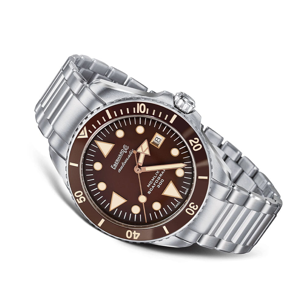 Eberhard Scafograf 300 "MCMLIX" 41034V.10 CA wykonany jest ze stali CHASSIS® z opatentowanym zapięciem DÉCLIC®. Matową tarczę typu „galbé” w kolorze brązowym sygnuje logo marki, spersonalizowana nazwa kolekcji oraz znak jakości Swiss Made. Zabezpiecza z kolei wypukłe, antyrefleksyjne szkło szafirowe. Trójkątna końcówka wskazówki godzinowej inspirowana jest modelem z 1959 roku. Wstawka na obrotowym bezelu z podświetlanymi 15 minutami wykonana jest z odpornej i eleganckiej ceramiki. Czasomierz wyposażony jest w wysoce precyzyjny i niezawodny, szwajcarski mechanizm mechaniczny oraz wodoodporny do głębokości blisko 300 m.
