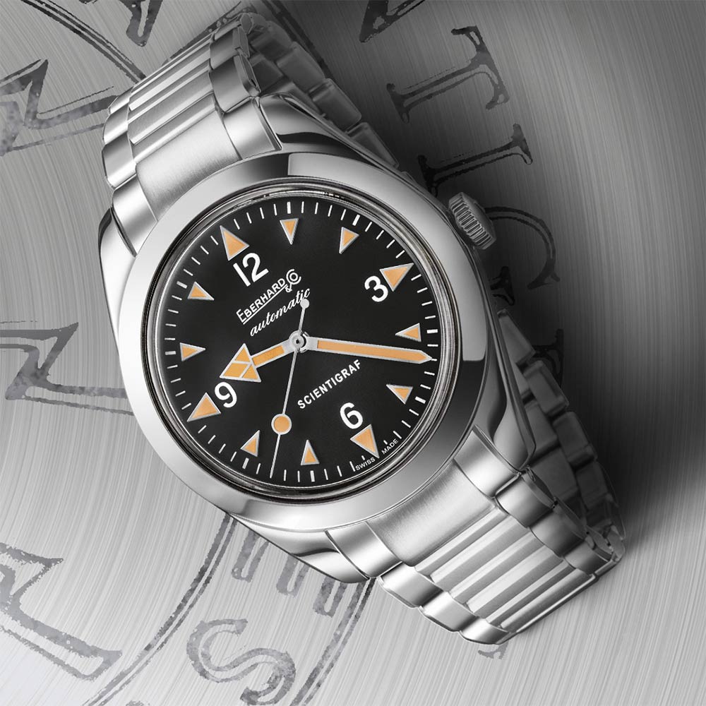 Na czym polegała technologia, która w latach 60. odniosła tak wielki sukces? Została zbudowana na prostej zasadzie, której włączenie do życia codziennego nie było już tak łatwe. Klatka Faradaya jest to konstrukcja złożona z miękkiego żelaza, która jest swego rodzaju tarczą dla ruchów zegarka. Jej zadaniem jest absorpcja fal elektromagnetycznych, aby uniemożliwiać dotarcie im do mechanizmów. Dziś pola magnetyczne stanowią dużo większe zagrożenie dla czasomierzy niż niegdyś, a to przez większą ilość urządzeń, takich jak telefony komórkowe, komputery, głośniki itp. Eberhard Scientigraf to nowa, "antymagnetyczna" edycja historycznego modelu, bazująca na cechach pioniera, a zarazem dostarczająca dóbr płynących z nowoczesnej technologii i wzornictwa. Zegarek męski o modelu 41043.02 CA posiada kopertę o średnicy 41 mm wodoodporną do 10 bar. Wykonana jest ona ze stali o zarówno błyszczącym, jak i satynowym wykończeniu oraz zawieszona na bransolecie Chassis®. Dekiel jest zakręcany, a ponadto spersonalizowany epokowym logo z napisem, odnoszącym się do testów pomyślnie przeprowadzonych w specjalistycznym centrum w La Chaux-de-Fonds, które udowadniają zgodność z normami ISO 764 2020. Ruch czasomierza wywołuje samonakręcający się mechanizm mechaniczny. Tarcza w kolorze czarnego matu zawiera oryginalną skalę godzin w formie cyfr arabskich pokrytych białą luminescencją oraz trójkątów wypełnionych pomarańczową luminescencją. Całość znajduje się pod wypukłym, antyrefleksyjnym i wysoce odpornym na zarysowania szkłem szafirowym.