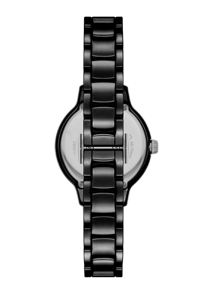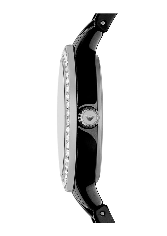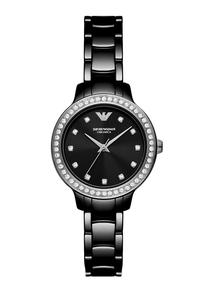 Zegarek damski Emporio Armani Cleo to okrągła koperta wykonana z ceramiki w rozmiarze 32 mm w kolorze czarnym. Na obudowie znajduje się pierścień, który ozdobiony został przepięknymi cyrkoniami. Zegarek zestawiony został z przyjemną w dotyku ceramiczną bransoletą z zapięciem motylkowym. Pod szkłem mineralnym znalazła się czarna estetyczna tarcza. Aktualną godzinę odczytamy dzięki smukłym wskazówkom. Na punktach godzinowych znalazło się 11 kamieni cyrkonu, które pięknie zdobią tarczę. Godzinę dwunastą zdobi dumne logo marki Emporio Armani.