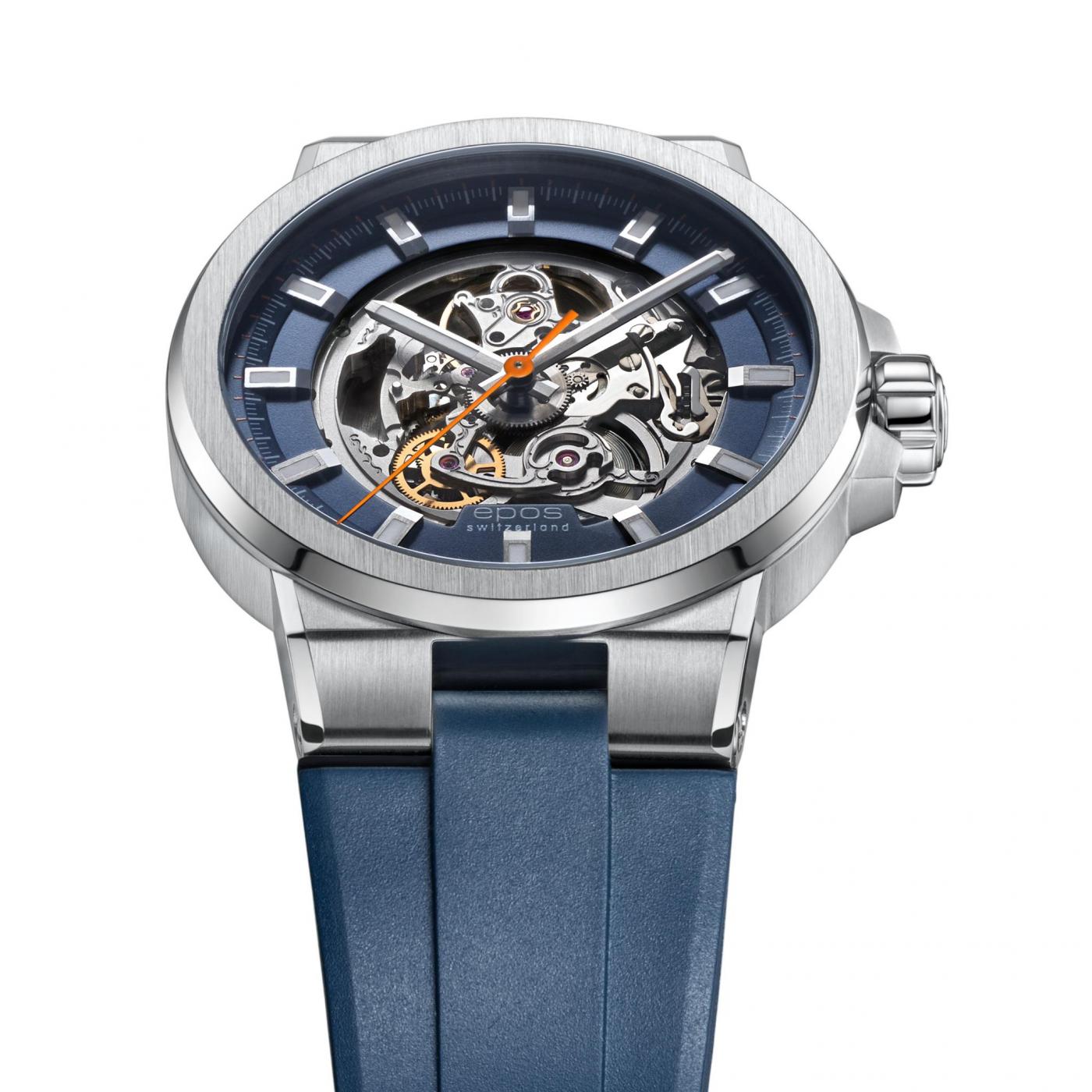 Najnowszym dodatkiem w sportowym świecie Eposa jest dynamiczny zegarek Epos Sportive Skeleton 3442.135.20.16.56. Wyposażony w pięknie zdobiony, szkieletowy mechanizm automatyczny Sellita SW200. Koperta z matowym wykończeniem i polerowanymi krawędziami jest zintegrowana z gumowym paskiem w kolorze niebieskim. Jej wymiary to 10,40 mm grubość o 42 mm średnicy. Kolejną atrakcją jest wyrafinowana dwuwarstwowa tarcza z wykończeniem Sunray i ręcznie nakładanymi indeksami z polerowaniem pod wieloma kątami.