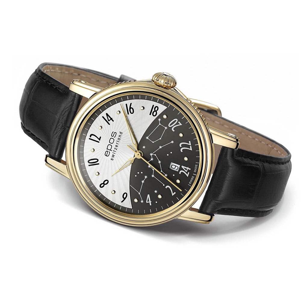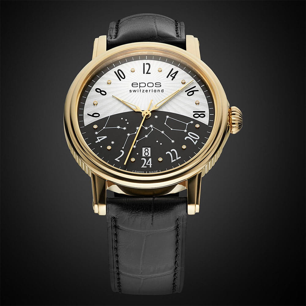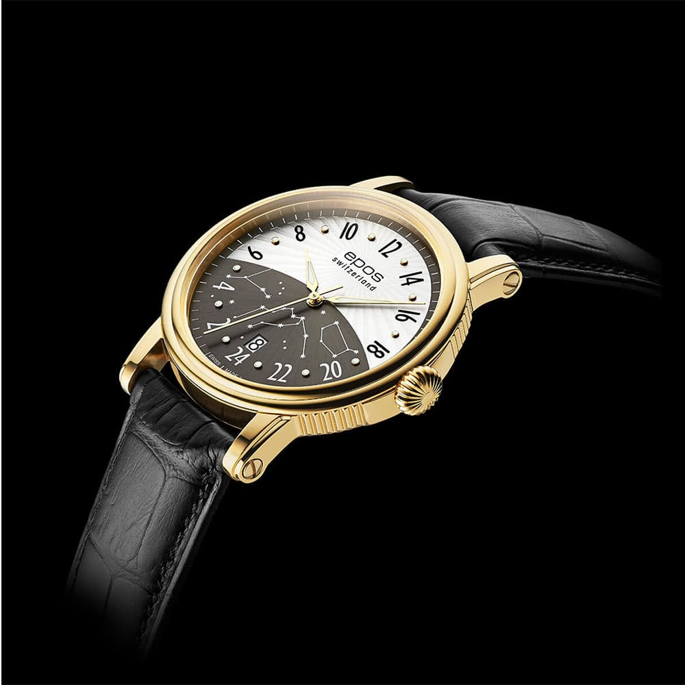 Epos Emotion 24 H 3390.302.22.38.25 to ekskluzywny zegarek szwajcarskiej firmy Epos, z mechanizmem automatycznym ETA 2892 zmodyfikowany i zdobiony przez inżynierów Eposa. To arcydzieło towarzyszyć będzie państwu przez cały dzień z tarczą w pełni 24 godzinową. Datownik z cyfrą dnia tygodnia znajduje się na godzinie 6. Koperta wykonana ze stali szlachetnej, wypolerowana na wysoki połysk, złocona żółtym złotem PVD z zakręcanym na śruby deklem, przez który widać pięknie zdobiony mechanizm. Tarcza została podzielona na sekcję dnia i nocy, co czyni go łatwym i szybkim w odczytaniu godziny. Piękna ilustracja z rozgwieżdżonym niebem na dolnej części tarczy a na górnej umieszczone zostało elegancko wykonane słońce.