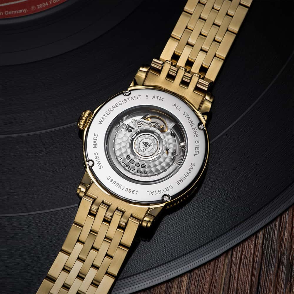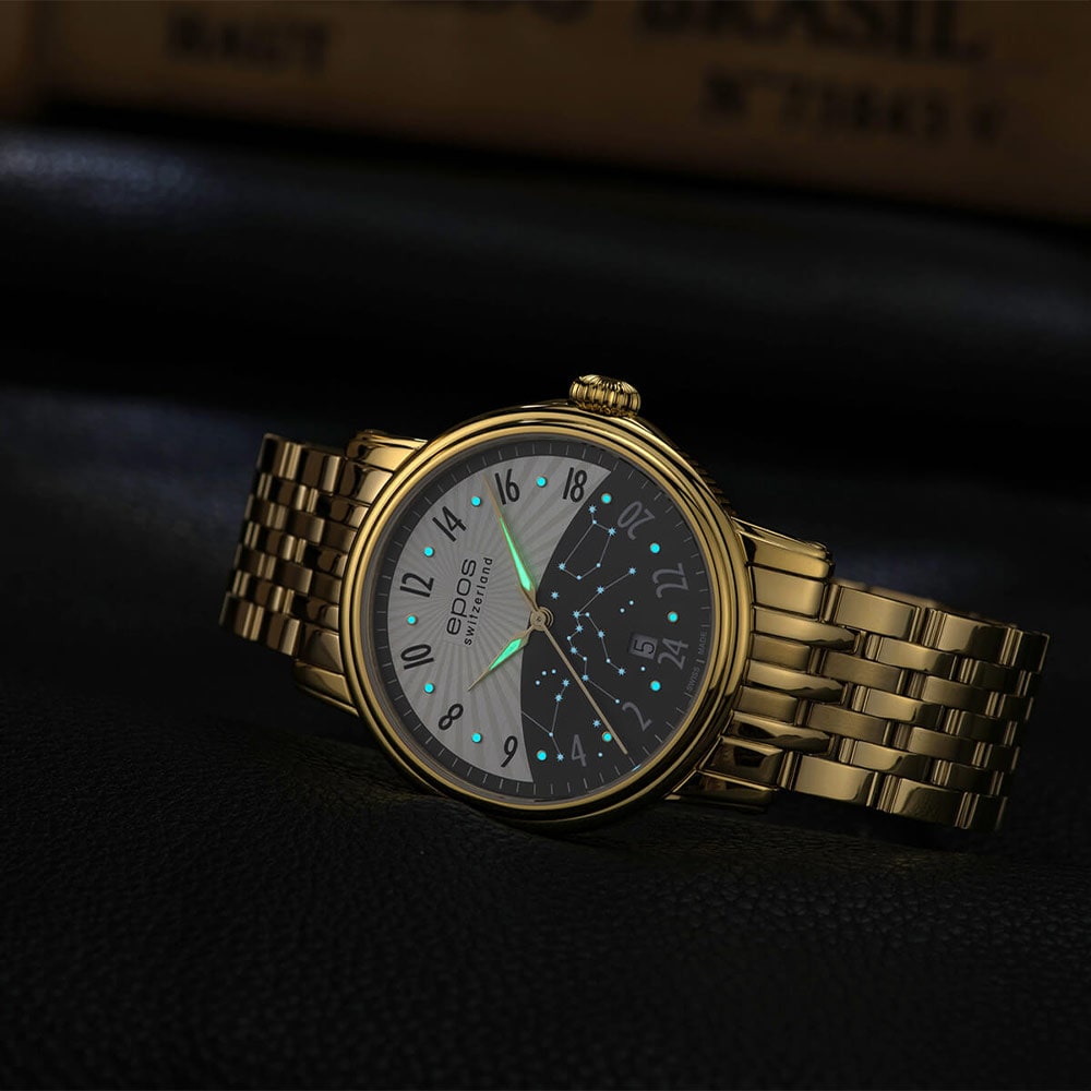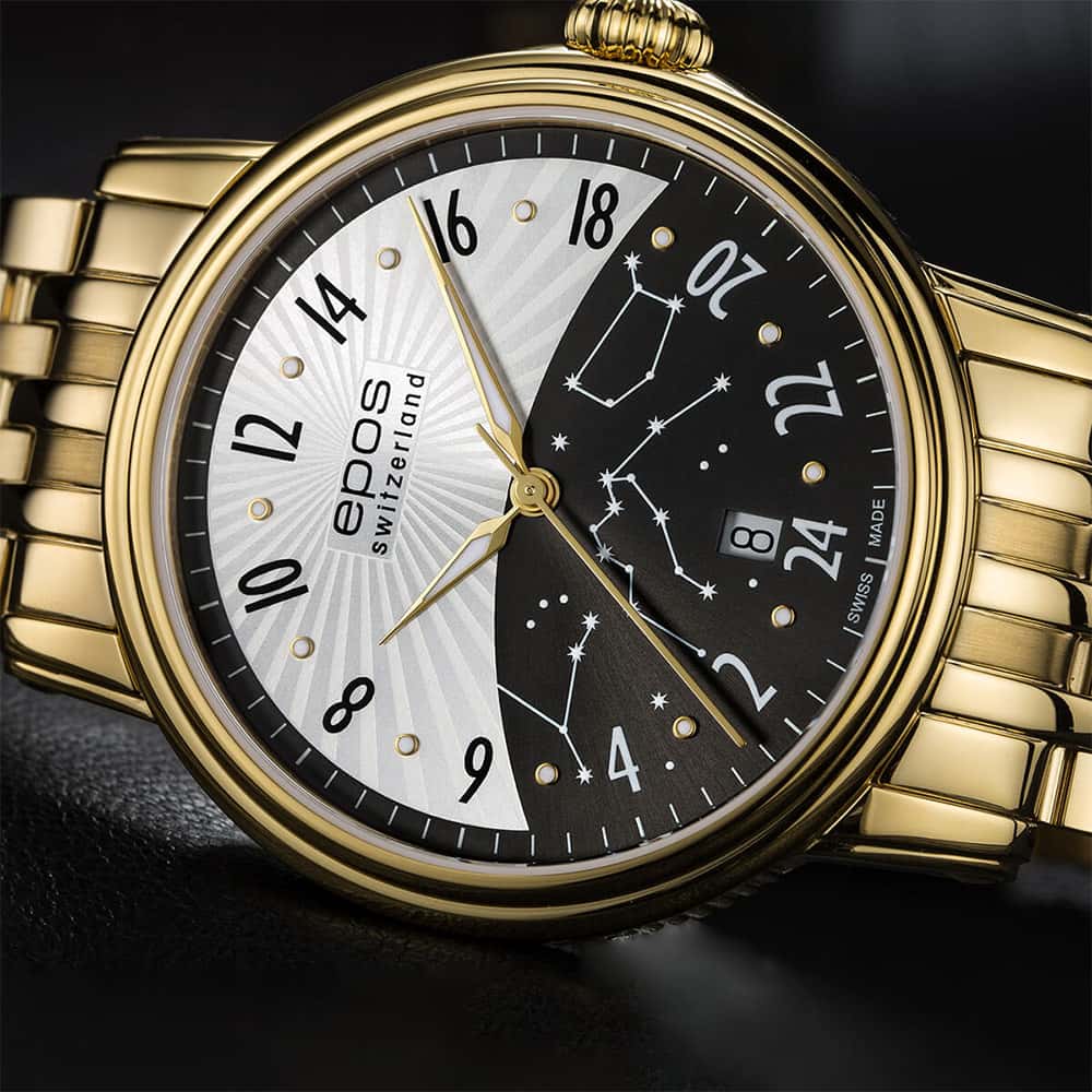 Epos Emotion 24 H 3390.302.22.38.32 to ekskluzywny zegarek szwajcarskiej firmy Epos, z mechanizmem automatycznym ETA 2892 zmodyfikowany i zdobiony przez inżynierów Eposa. To arcydzieło towarzyszyć będzie państwu przez cały dzień z tarczą w pełni 24 godzinową. Datownik z cyfrą dnia tygodnia znajduje się na godzinie 6. Koperta wykonana ze stali szlachetnej, wypolerowana na wysoki połysk, złocona żółtym złotem PVD z zakręcanym na śruby deklem, przez który widać pięknie zdobiony mechanizm. Tarcza została podzielona na sekcję dnia i nocy, co czyni go łatwym i szybkim w odczytaniu godziny. Piękna ilustracja z rozgwieżdżonym niebem na dolnej części tarczy a na górnej umieszczone zostało elegancko wykonane słońce.