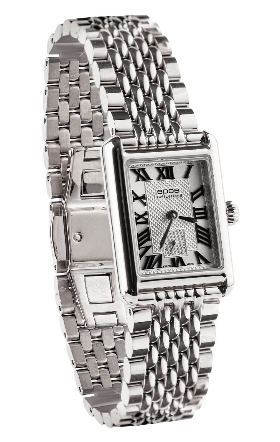 Damski zegarek Epos to elegancki model o prostokątnej kopercie zestawionej z jubilerską bransoletą. Srebrna tarcza z rzymskimi indeksami i małą sekundą na godzinie szóstej emanuje wyrafinowaniem. Całość dopełnia szafirowe szkło i precyzyjny szwajcarski mechanizm kwarcowy.