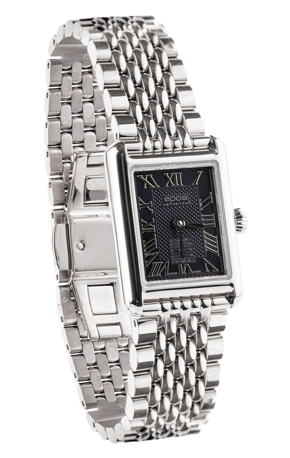 Damski zegarek Epos to elegancki model o prostokątnej kopercie zestawionej z jubilerską bransoletą. Czarna tarcza z rzymskimi indeksami i małą sekundą na godzinie szóstej emanuje wyrafinowaniem. Całość dopełnia szafirowe szkło i precyzyjny szwajcarski mechanizm kwarcowy.