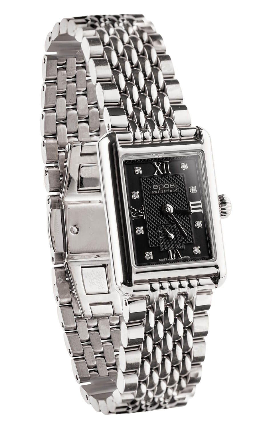 Damski zegarek Epos to elegancki model o prostokątnej kopercie i biżuteryjnej bransolecie. Czarna tarcza z ośmioma diamentami, rzymskimi indeksami i małą sekundą na godzinie szóstej emanuje wyrafinowaniem. Całość dopełnia szafirowe szkło i precyzyjny szwajcarski mechanizm kwarcowy.