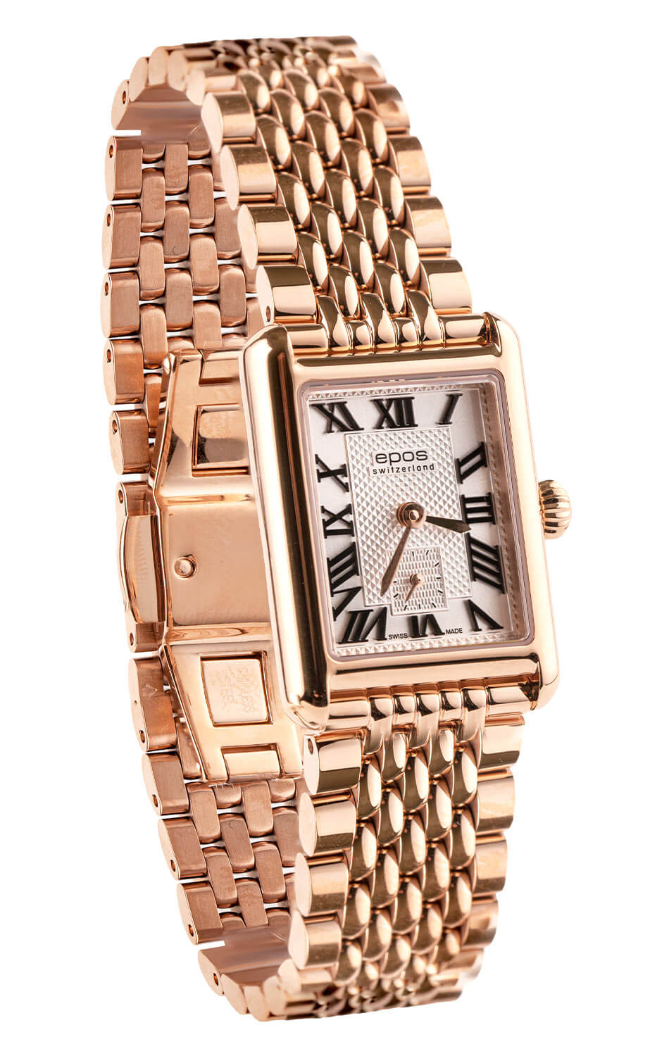 Damski zegarek pozłacany Epos to elegancki model o prostokątnej kopercie zestawionej z jubilerską bransoletą. Srebrna tarcza z rzymskimi indeksami i małą sekundą na godzinie szóstej emanuje wyrafinowaniem. Całość dopełnia szafirowe szkło i precyzyjny szwajcarski mechanizm kwarcowy.