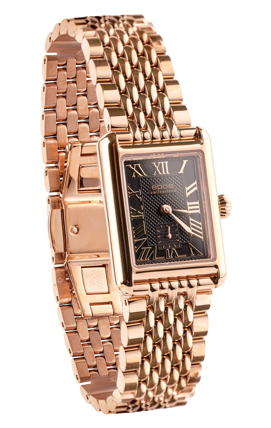 Damski zegarek pozłacany Epos to elegancki model o prostokątnej kopercie zestawionej z jubilerską bransoletą. Czarna tarcza z rzymskimi indeksami i małą sekundą na godzinie szóstej emanuje wyrafinowaniem. Całość dopełnia szafirowe szkło i precyzyjny szwajcarski mechanizm kwarcowy.