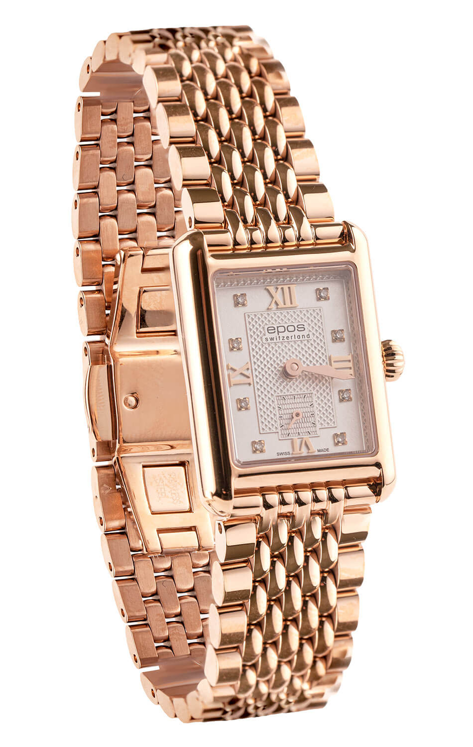 Damski zegarek Epos to elegancki model o prostokątnej kopercie i biżuteryjnej bransolecie w różowo-złotej powłoce PVD. Srebrna tarcza z ośmioma diamentami, rzymskimi indeksami i małą sekundą na godzinie szóstej emanuje wyrafinowaniem. Całość dopełnia szafirowe szkło i precyzyjny szwajcarski mechanizm kwarcowy.