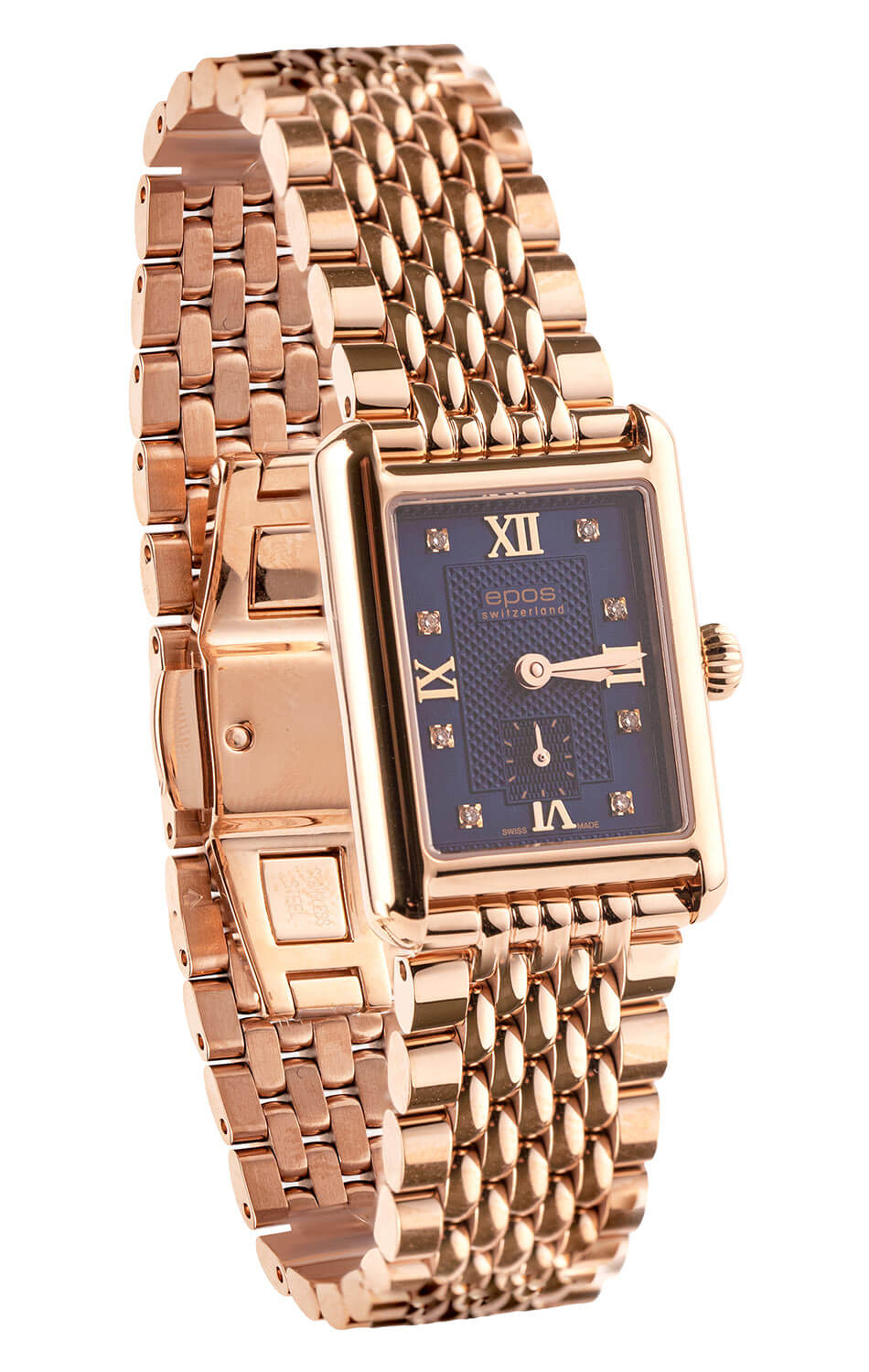 Damski zegarek Epos to elegancki model o prostokątnej kopercie i biżuteryjnej bransolecie w różowo-złotej powłoce PVD. Granatowa tarcza z ośmioma diamentami, rzymskimi indeksami i małą sekundą na godzinie szóstej emanuje wyrafinowaniem. Całość dopełnia szafirowe szkło i precyzyjny szwajcarski mechanizm kwarcowy.