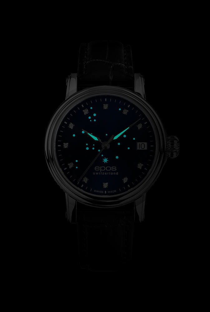 Do damskiej kolekcji szwajcarskiej marki Epos dołączyła nowa, szykowna kreacja. Zegarek Epos 4390 North Star Ladies, który posiada na tarczy świecącą gwiazdę polarną jako światło przewodnie w nocy oraz 11 diamentów mieniących się w jasnym świetle dziennym.