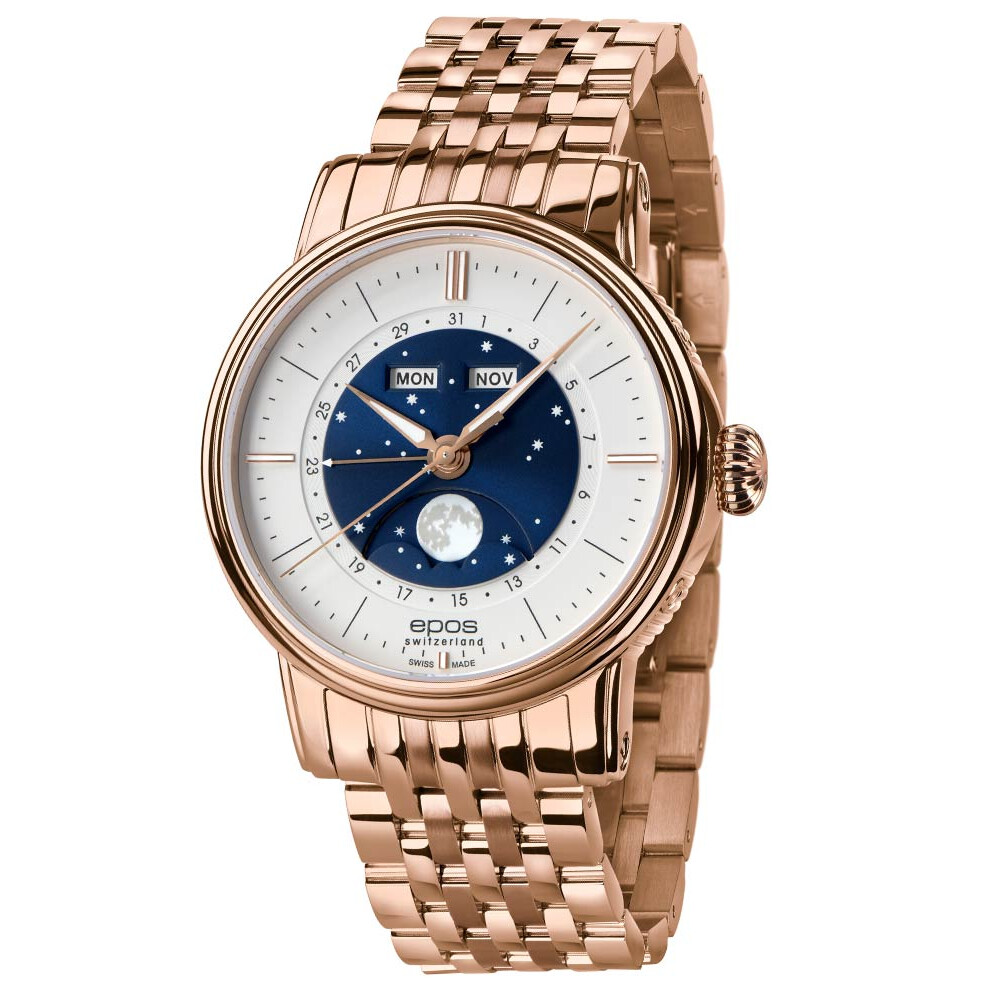 Epos Oeuvre D'Art Classic 3439.322.24.18.34 w pięknej, złoconej różowym złotem PVD kopercie o średnicy 41,7 mm. Wewnątrz znajduj się automatyczny mechanizm Sellita SW300 z zaprojektowanym przez inżynierów Epos modułem Epos Big Moon. Werk wykonany z dbałością o najmniejszy szczegół i ozdobiony pięknym wzorem Côtes de Genève, który jest widoczny przez przeszklony szafirowym szkłem, zakręcany na śruby dekiel. Funkcje dodatkowe, takie jak wskazanie dnia tygodnia i miesiąca, wskaźnik daty i bardzo duży wskaźnik fazy księżyca, są ulubionymi funkcjami większości entuzjastów zegarków i nadal występują w tym niezwykłym zegarku.