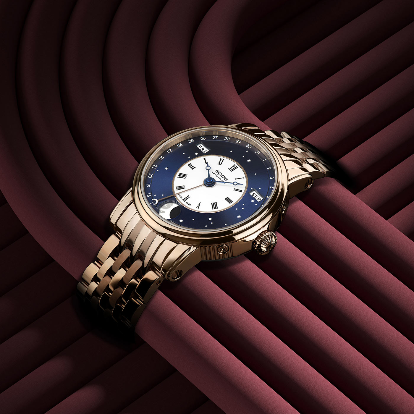 Zegarek Epos Oeuvre D’Art V-Style 3439.322.24.26.34 jest wyposażony w zaprojektowany przez inżynierów Epos wewnętrzny moduł Epos Big Moon Module. Jest on połączony z wysokiej jakości, w pełni zdobionym, samo nakręcającym się mechanizmem Sellita SW300. Werk wykonany z dbałością o najmniejszy szczegół i ozdobiony pięknym wzorem Côtes de Genève, który jest widoczny przez przeszklony szafirowym szkłem, zakręcany na śruby dekiel. Funkcje dodatkowe, takie jak wskazanie dnia tygodnia i miesiąca, wskaźnik daty i bardzo duży wskaźnik fazy księżyca, są ulubionymi funkcjami większości entuzjastów zegarków i nadal występują w tym niezwykłym zegarku. Są umieszczone po bokach i na dole niebieskiej, rozgwieżdżonej ramki tworząc wzór w literę V. Zegarek posiada solidną, złoconą różowym złotem PVD obudowę o średnicy 41,70 mm i grubości zaledwie 10,70 mm, której towarzyszy wodoodporność do 5 barów 50 m.