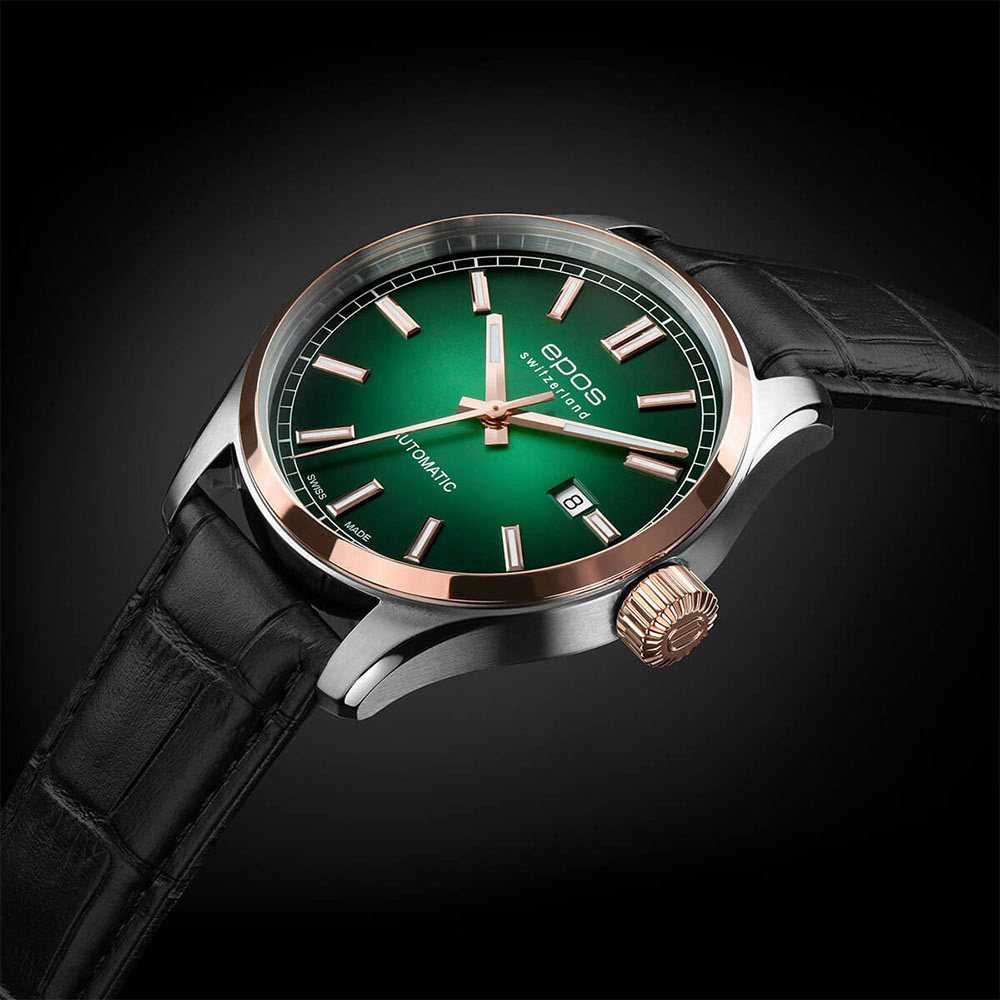Ten powstały w zaciszu szwajcarskich warsztatów luksusowy automat prezentuje się niezwykle okazale oraz urzekająco, dzięki swemu, kolorystycznemu połączeniu. Składają się na nie: czarny, skórzany pasek z zapięciem klamrowym, solidna, wykonana z wytrzymałej stali szlachetnej koperta (o powłoce bikolor PVD), której specyfika uchroni ją przed rdzą, a także skutecznie i na długo odeprze efekt matowienia, oraz zielona tarcza o głębokiej zieleni z połyskiem Sunray. Połysk ten jest dużym, wizualnym atutem czasomierza, za sprawą swych promienistych odbić mieniącego się zieloną poświatą światła widocznego na brzegach tarczy, w zależności od kąta patrzenia. Taki cyferblat osłaniany jest przez topowe szkło szafirowe odporne na zarysowania i bardzo przejrzyste. Starannie, a do tego ręcznie nałożone indeksy godzinowe o kształcie sztabek oraz wskazówki z kolei nie tylko współgrają stylistycznie z całą istotą zegarka, ale przy tym posiadają cenny, funkcjonalny atut, jakim jest pokrycie ich substancją luminescencyjną. Substancja ta rozszerza użytkownikowi zakres jego możliwości, czyniąc odczyt czasu możliwym także po zmroku. Na uwagę zasługuje także pozłacana koronka z logo marki. Swój wyszukany wizerunek zawdzięcza wykonanym fazom oraz polerowanym i ręcznie żłobionym krawędziom.