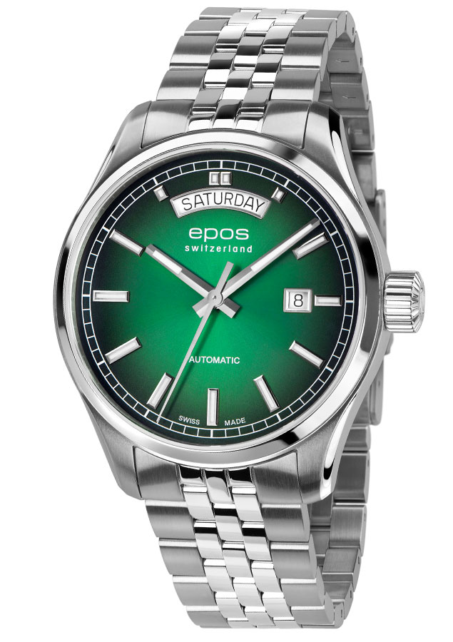 EPOS 3501 Day Date napędza pięknie zdobiony i samo nakręcający się mechanizm Sellita SW240. Szwajcarski werk jest widoczny przez przeszklony mineralnym szkłem dekiel. Popularna koperta Epos Passion o średnicy 41 mm jest idealną obudową na męski nadgarstek. Ozdobiona polerowanym pierścieniem i polerowanymi brzegami. Oprócz datownika na godzinie 12 i na 3 ten wysokiej jakości zegarek jest wodoszczelny do 100 m 10 barów, a odporne na zarysowania szafirowe szkiełko jest integralną częścią standardu jakości EPOS. Zielona tarcza z pięknymi przejściami dodatkowo jest ozdobiona szlifem słonecznym, który rozprowadza światło od centrum po brzegi cyferblatu.
